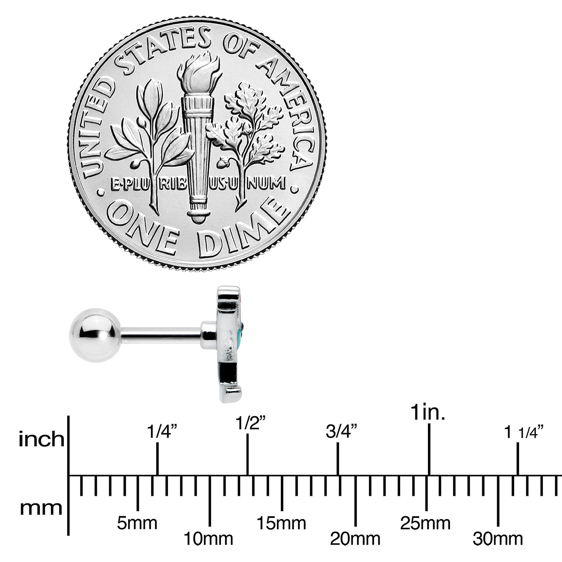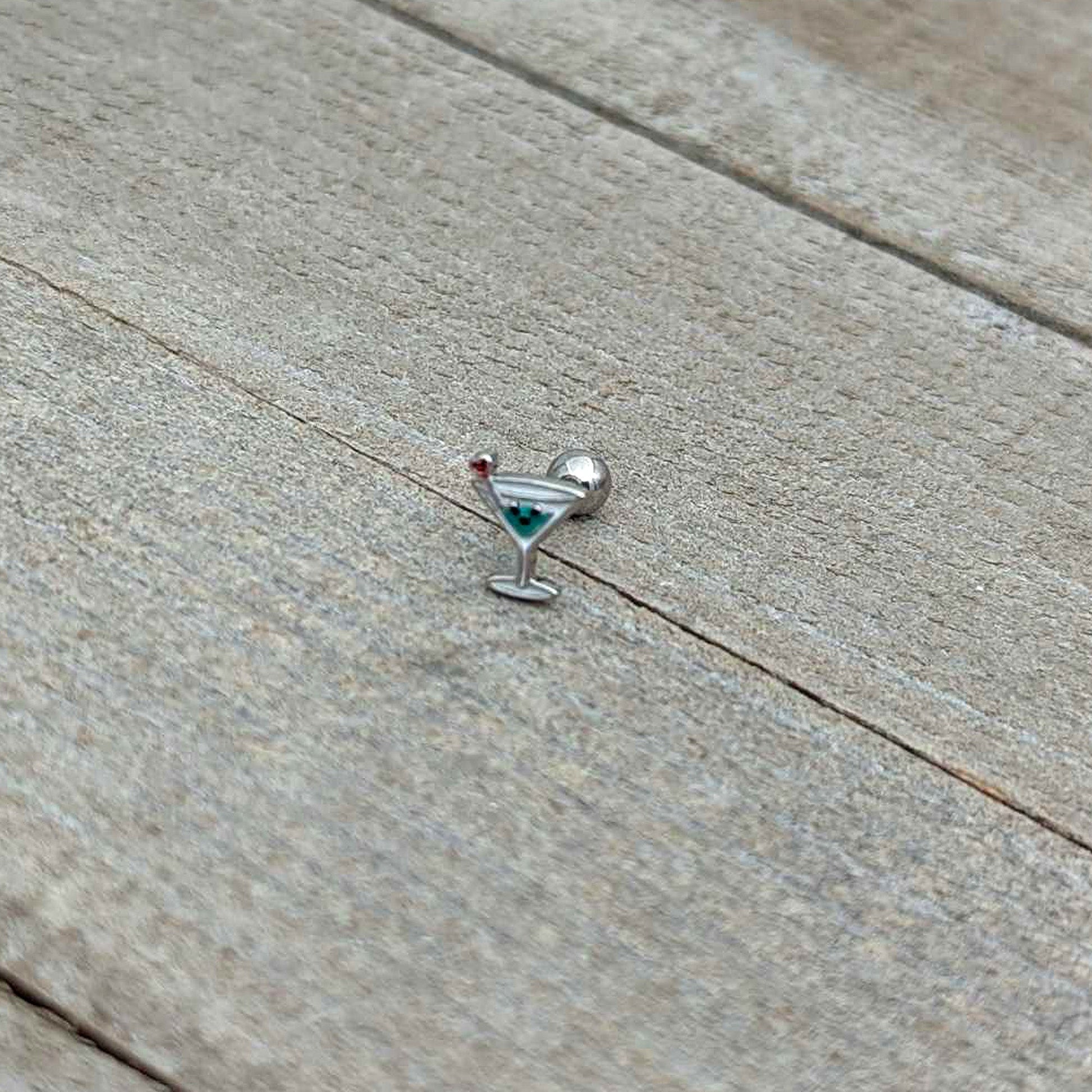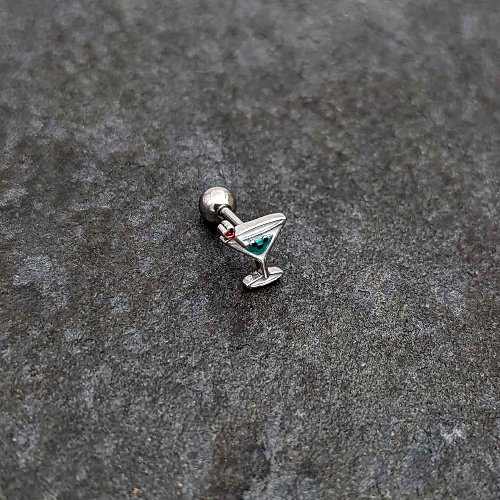 Bottoms up for style, with this 16 gauge tragus stud! It's made with a 6mm durable 316L surgical grade stainless steel straight barbell with a 4mm ball end. It features a martini glass charm, with blue embellishment and a heart-ended swizzle stick. It also features a face on the glass and you can rock it in multiple piercings including tragus, helix, and some conch piercings. Drink in the compliments when you're rocking this cocktail-themed cartilage piercing jewelry!Specifications