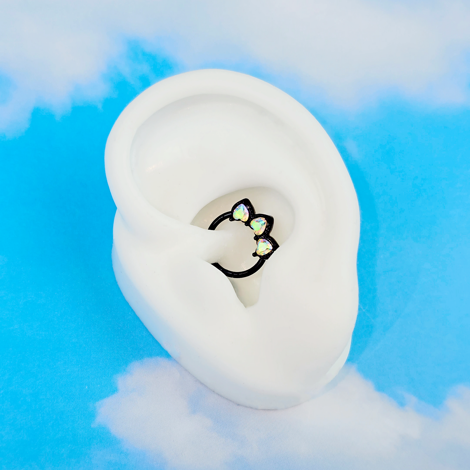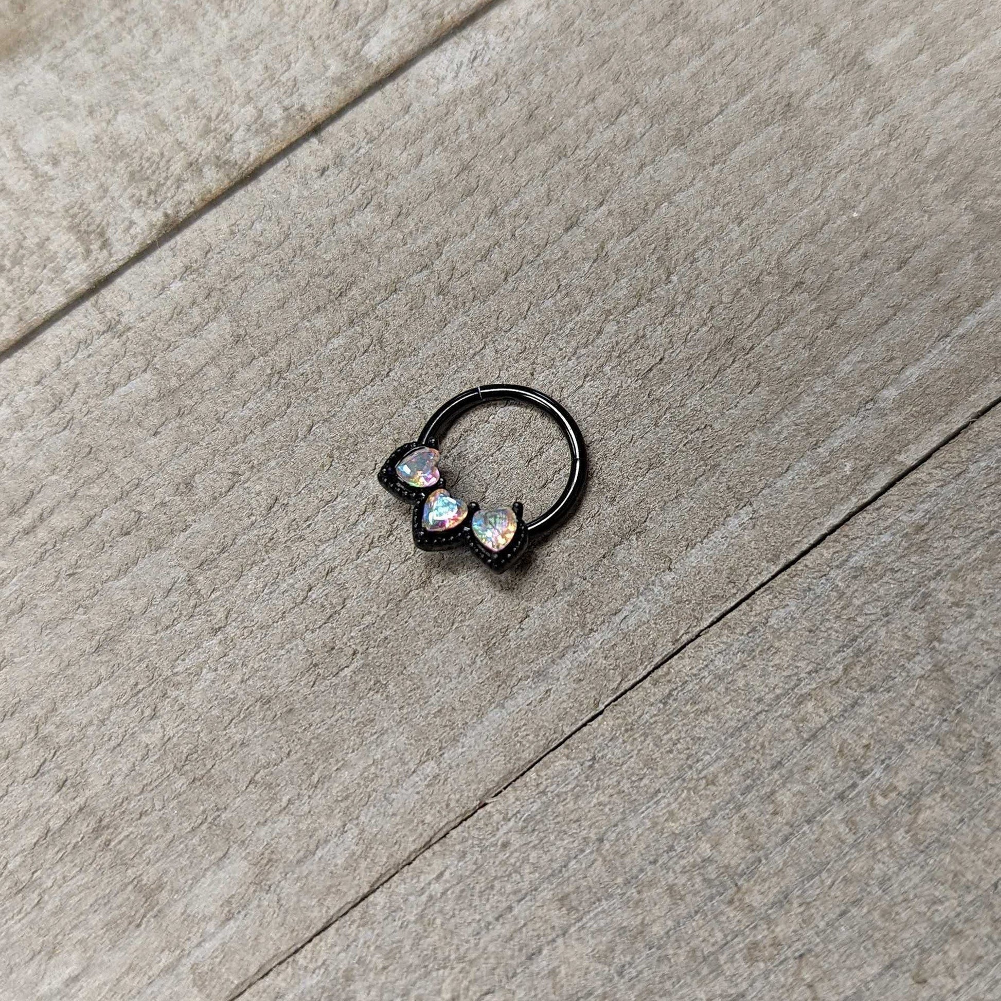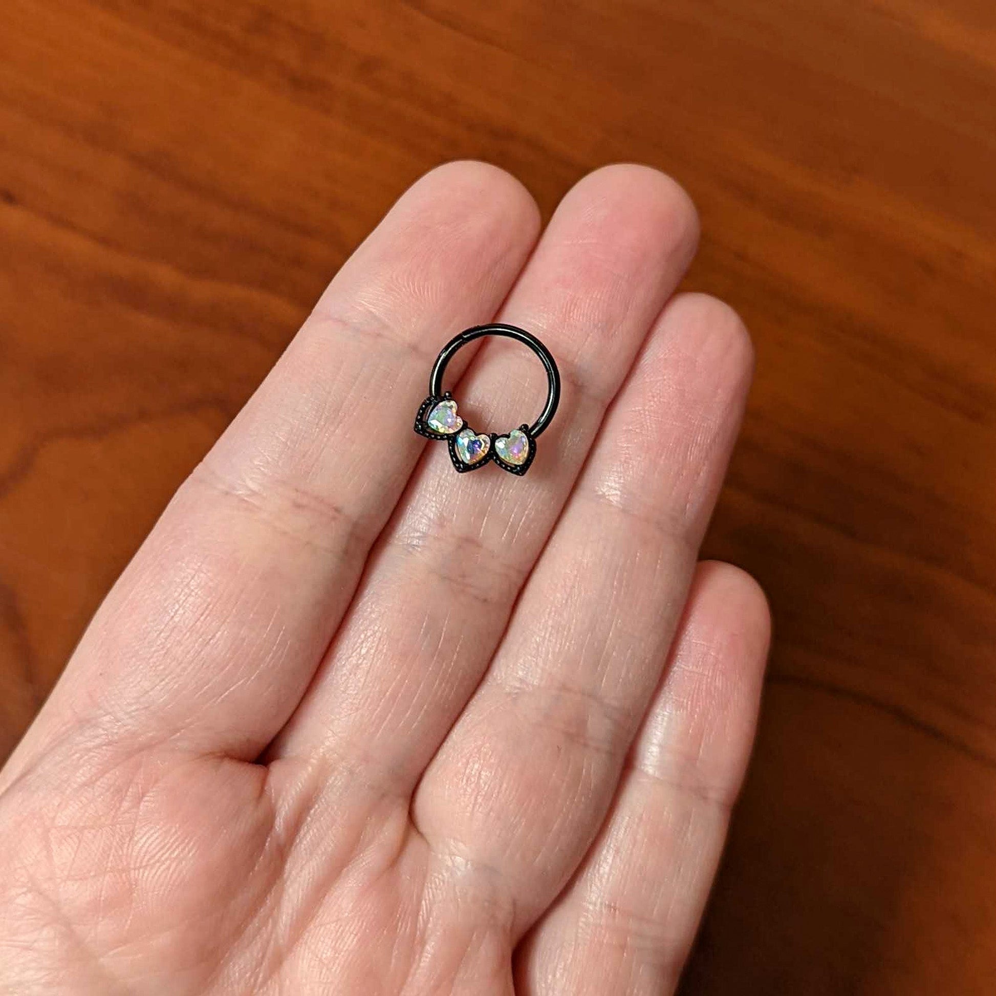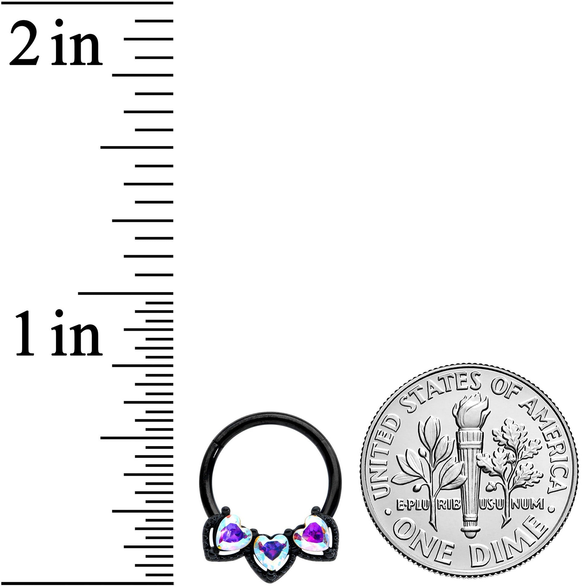 Look luxe and love it without breaking the bank with this 16 gauge septum ring! It's made with a 10mm black PVD over 316L surgical grade stainless steel hinged circular ring. It features a triple heart charm, with each heart composed of a single aurora gem. It also features a non-removable, hinged segment that makes insertion and removal a snap. You can even rock these hearts in multiple piercings including tragus, helix, and some daith piercings. You're going to fall in love with the opulent look of this heart-themed cartilage piercing ring!Specifications