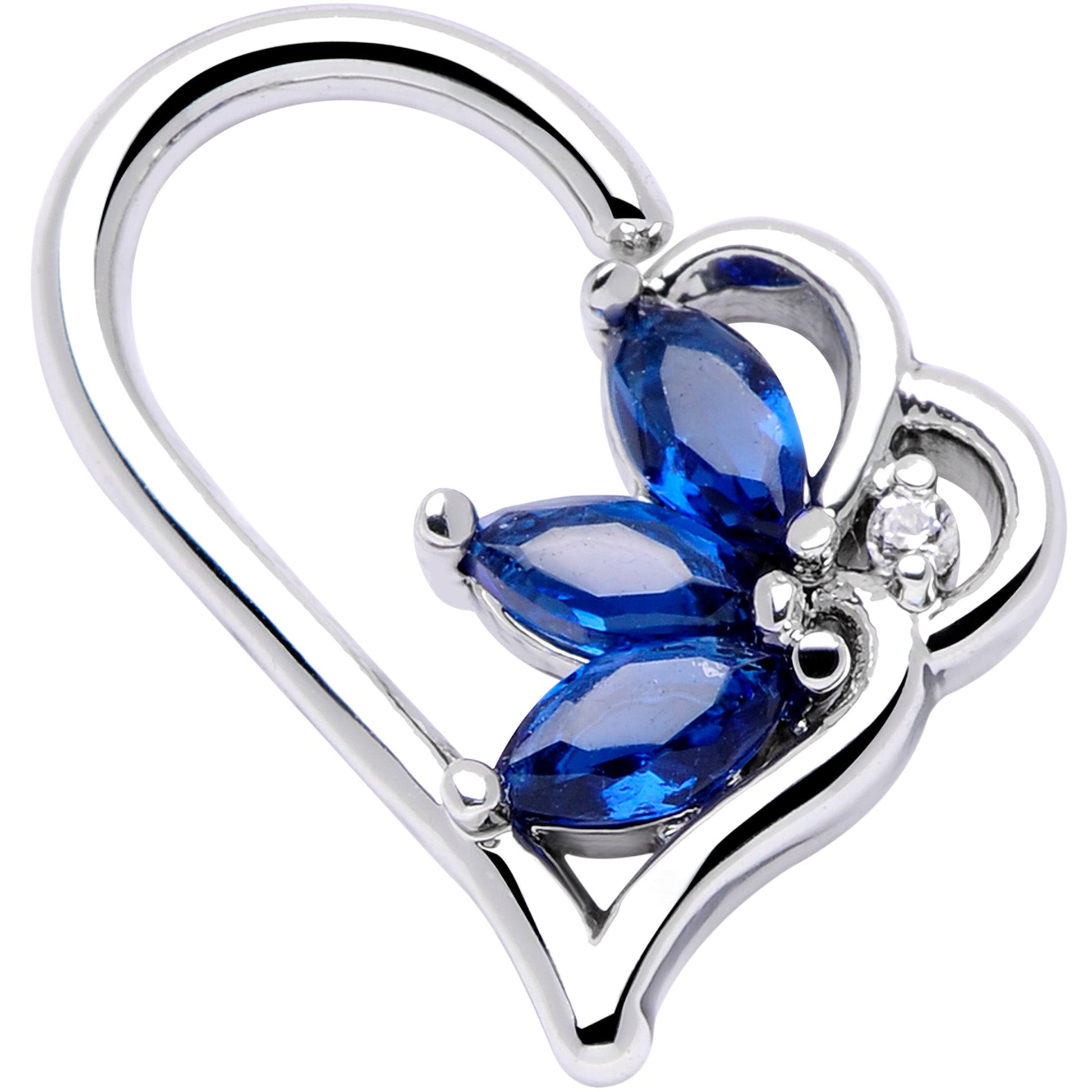 Half a heart is better than a whole one when it's this beautiful 16 gauge cartilage earring! It's 10mm and made with 316L surgical grade stainless steel. It's designed for a left ear piercing, featuring the shape of half of a heart. Inside the heart art three navy blue gems, set to resemble the petals of a flower for a look that's truly romantic. These are super easy to insert and remove - simply twist the ring open, insert, and then twist gently shut again. You'll love this feature because this works so well in multiple piercings including cartilage piercings like the daith, helix, tragus, and more. This half heart cartilage ring is sure to steal all of yours!Specifications