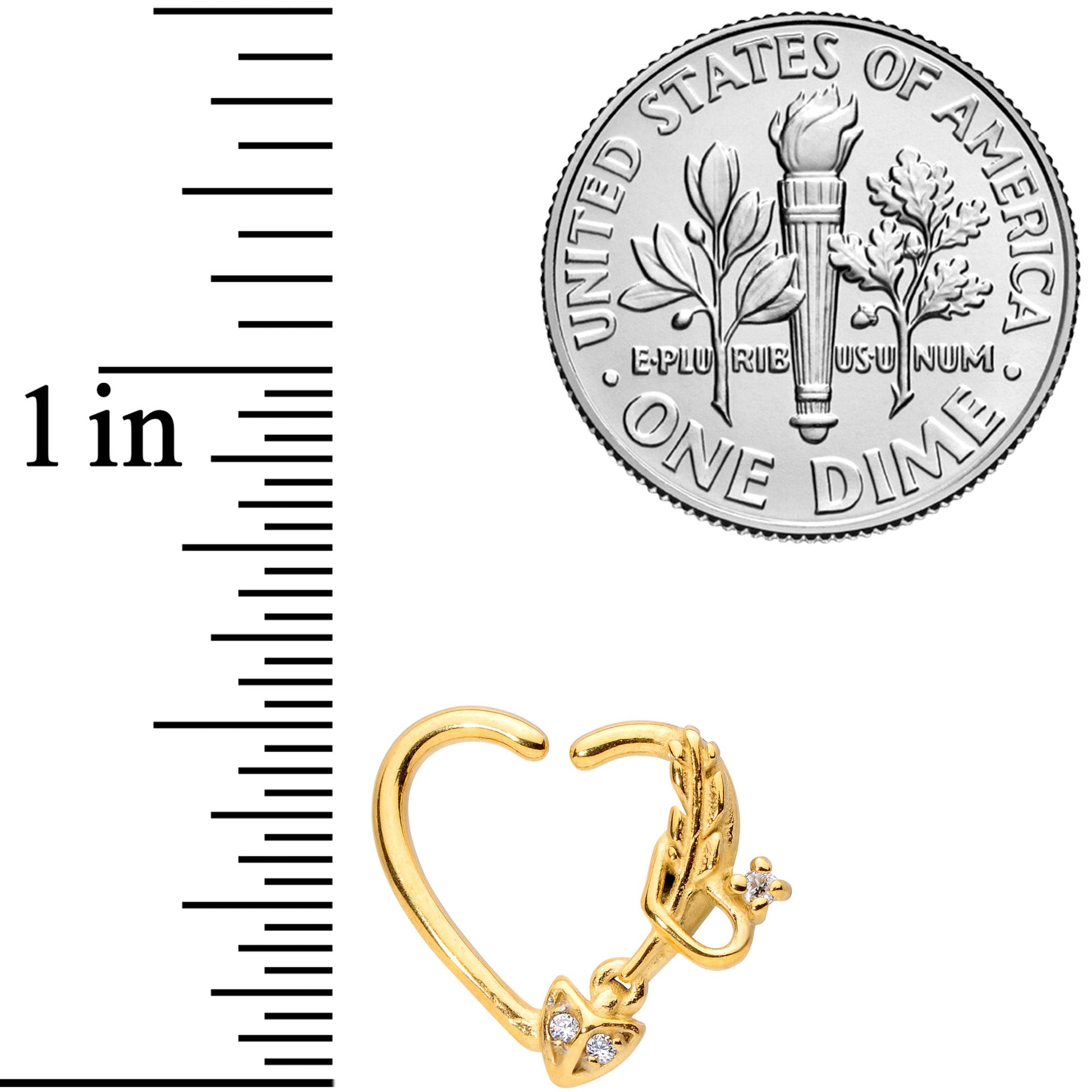 Have you been waiting for Cupid to find you with his arrows? Well, wait no longer with this 16 gauge cartilage earring! It's made with 10mm gold tone PVD over 316L surgical grade stainless steel and is made to be worn in the left ear. This heart shaped cartilage ring features an arrow on one side, complete with textured detailing of the feathers. The arrow's head is paved with clear cubic zirconia gems for an added pop of glamour. To insert, just give it a light twist, insert it into your piercing and gently bend it closed. It works perfectly in multiple cartilage piercings including daith, tragus, rook, and helix. Take your best shot cupid, our heart is already taken this Valentine's Day!Specifications