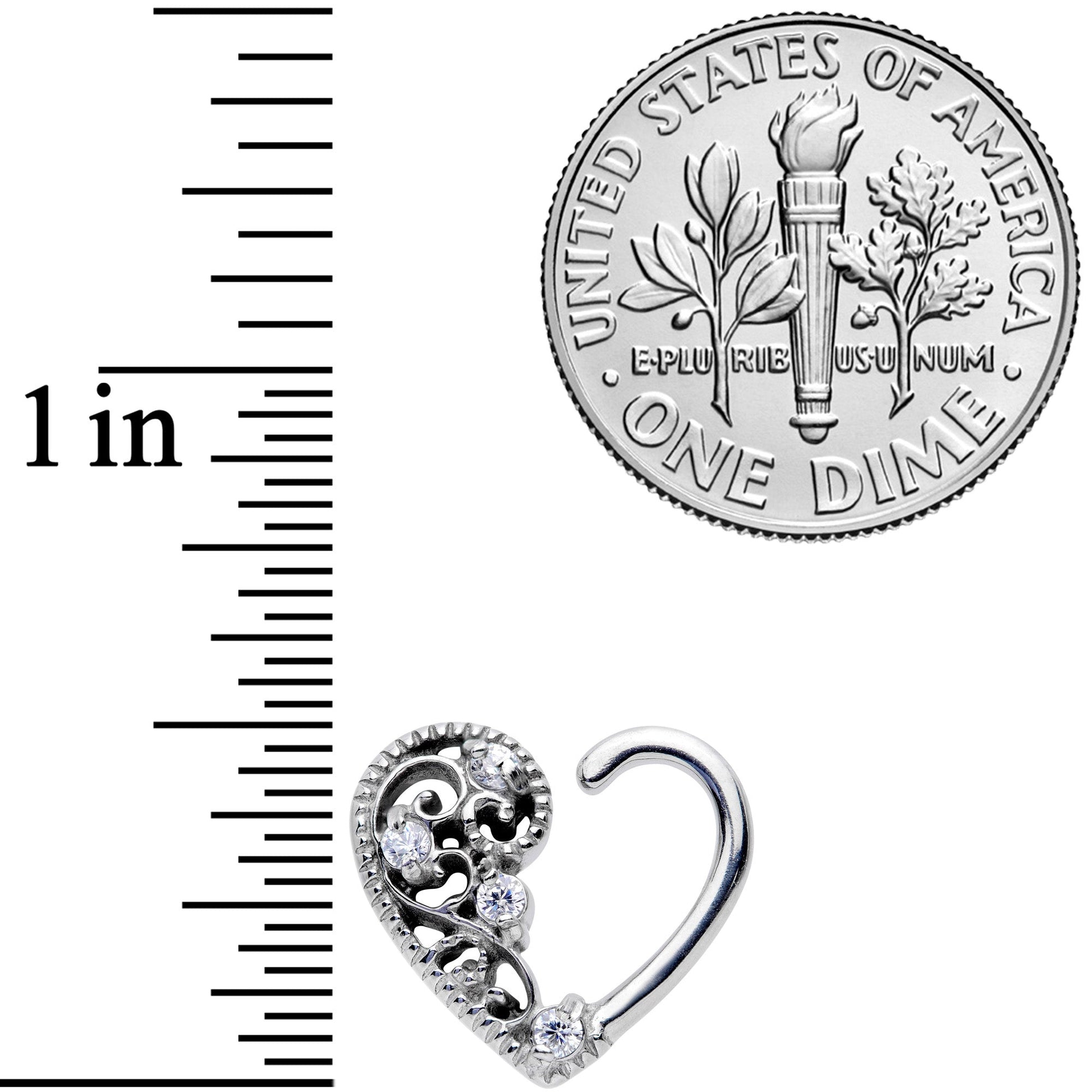 Add a touch of class to a modern piece of body jewelry with this 16 gauge cartilage earring! It's made with 10mm durable 316L surgical grade stainless steel and is designed to be worn in the right ear. It features a scrolling deco-inspired design on the right side as well as several clear cubic zirconia gems. A cartilage ring like this one is easy to insert and remove - just give it a light twist, insert it into your piercing and gently bend it closed. You'll love that because it works so well in multiple piercings including daith, tragus, rook, and helix.Specifications