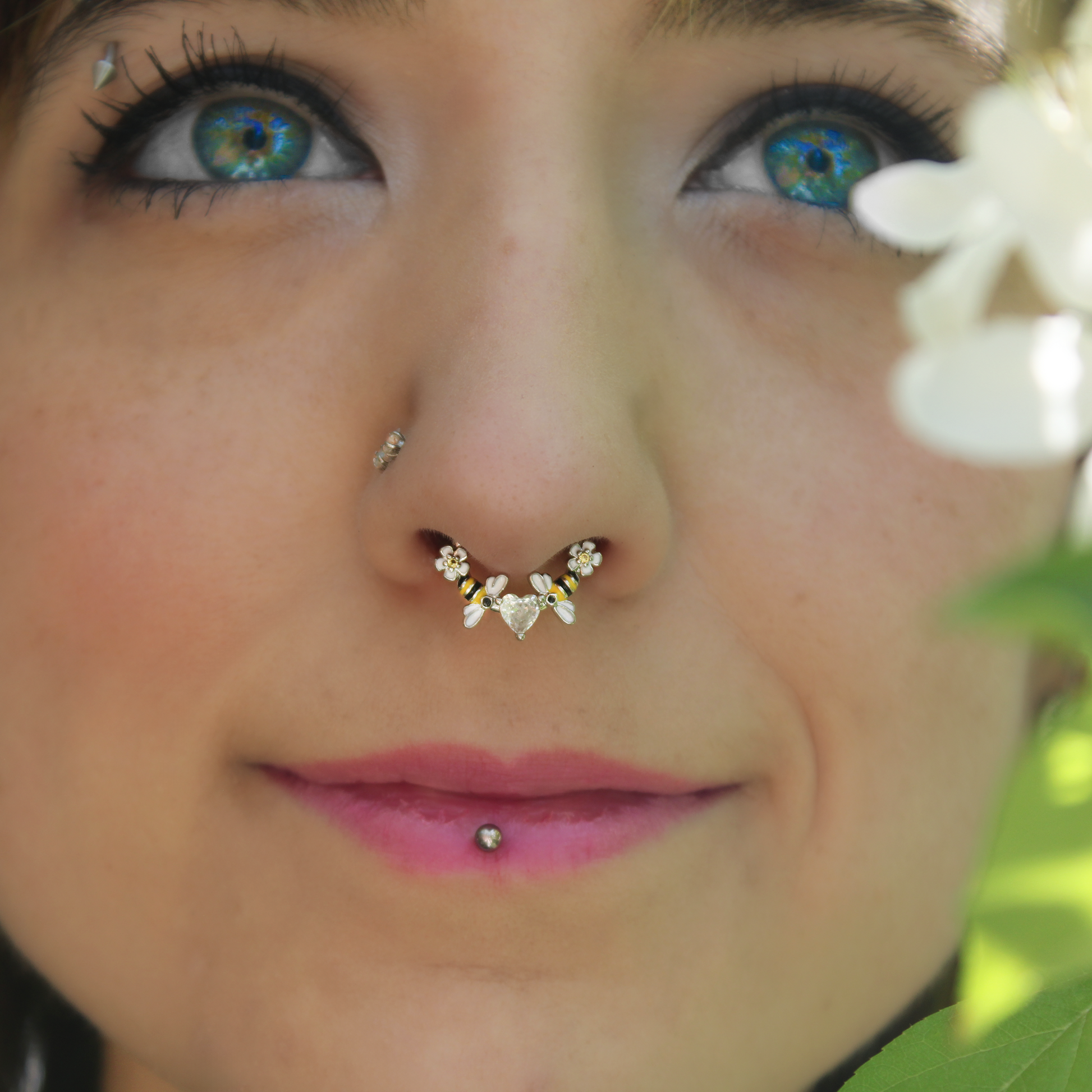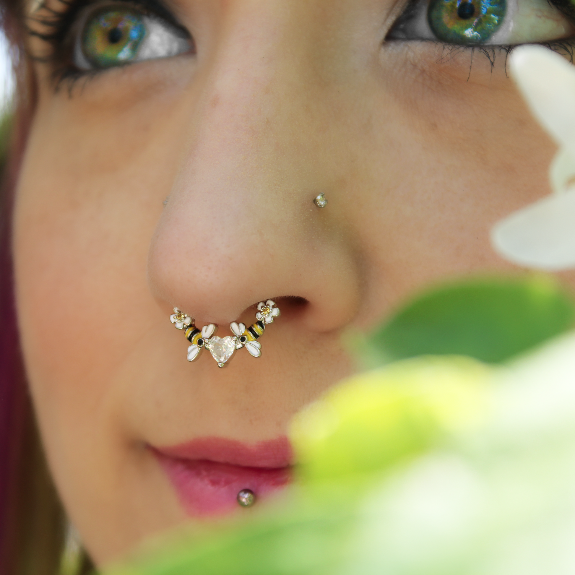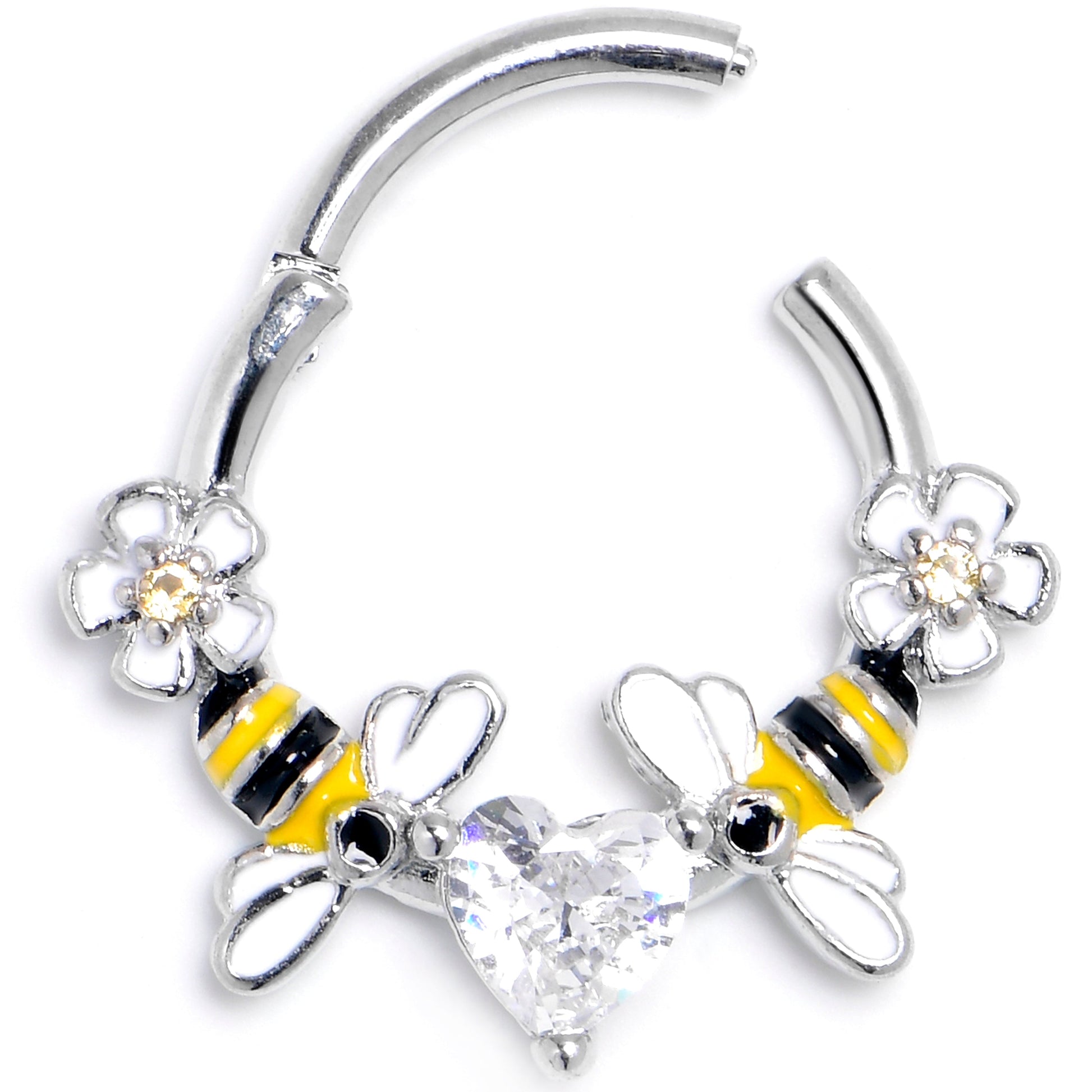 You will bee living your best life when you are rocking this 16 gauge septum ring. It is made with a 10mm durable 316L surgical grade stainless steel hinged circular ring. It features a clear cubic zirconia gem heart at the center, flanked by bee charms inlaid in yellow and black. The furthest ends feature tiny white daisy flowers. It also features a non-removable, hinged segment that makes insertion and removal a breeze and you can rock it in multiple piercings including tragus, helix, and some daith piercings. Bee ready to love your look with this sweet as honey cartilage piercing jewelry.Specifications