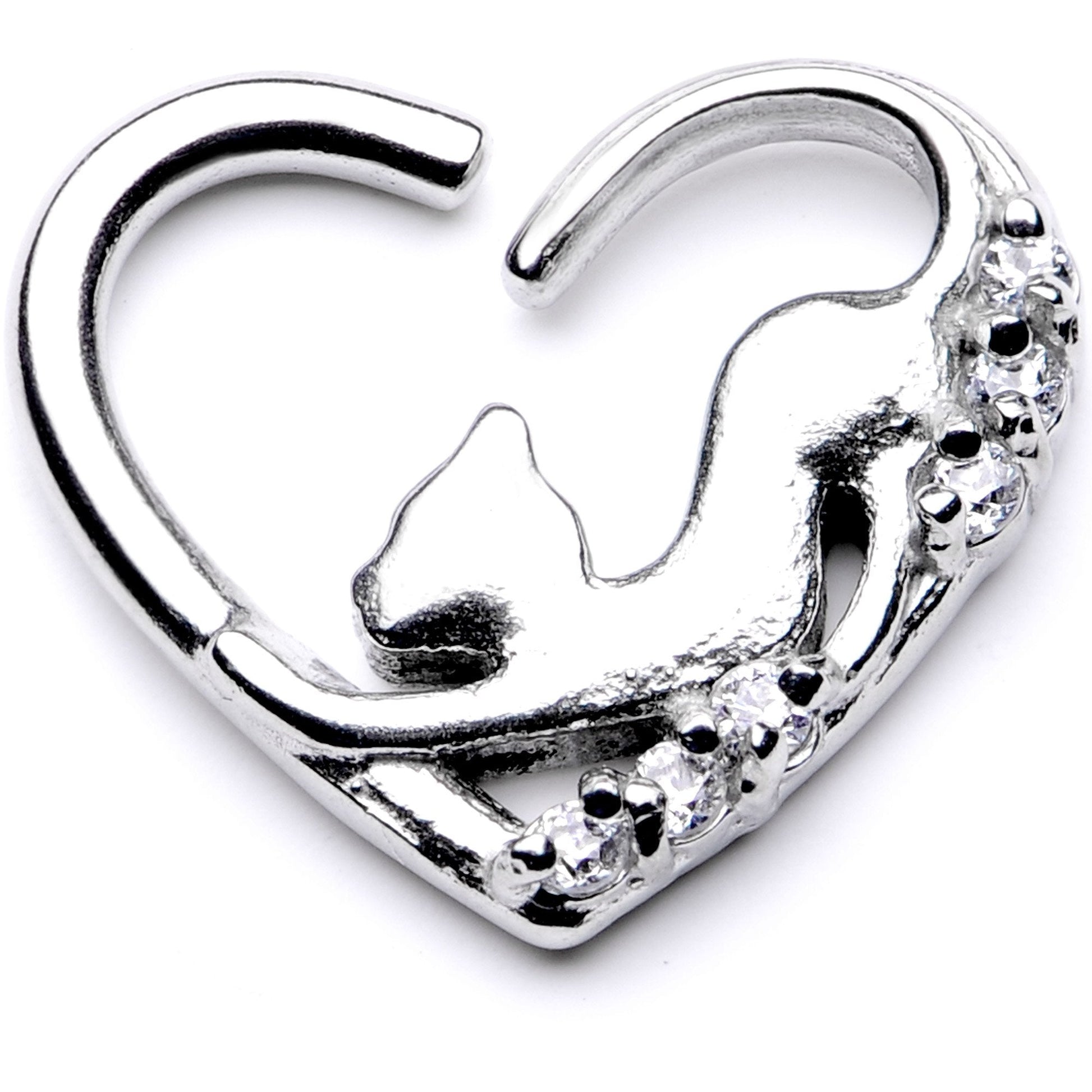 The fun kitty cat on this heart-shaped closure ring is just relaxing. One side of this heart-shaped closure ring features a fun kitty cat just stretching out next to her pile of clear cubic zirconia gems. Designed to be worn in the left ear, this beautiful heart-shaped ring is made with durable 316L surgical grade stainless steel. To use, twist the ends slightly and gently pull away to insert into your piercing. This cartilage earring is perfect for wearing in a variety of ear piercings including the helix, tragus, rook, and daith!Specifications