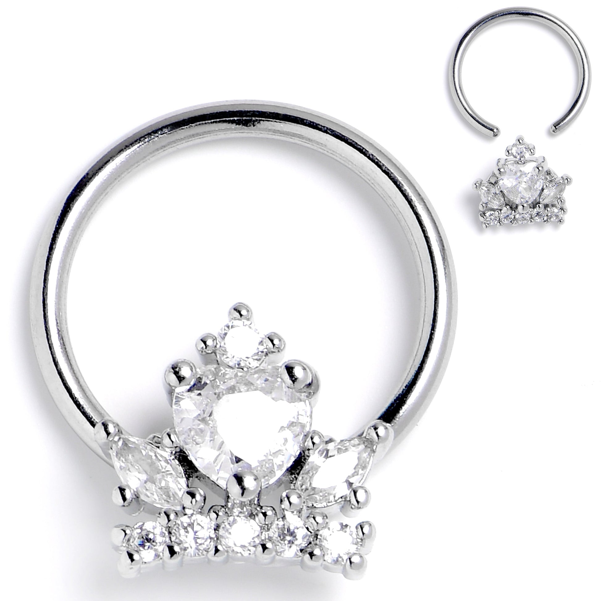 Crown your piercings in style with this elegant 16 gauge septum ring. It is made with a 10mm durable 316L surgical grade stainless steel circular ring. It features a crown charm, composed of clear cubic zirconia gems for a truly regal look. The center of the crown features a heart shaped clear cubic zirconia gem for added style. It also features a captive charm design for securre wear and you can rock it in multiple piercings including tragus, helix, and some daith piercings. Rock this regal crown and feel like the royalty you are with this elegant, aristocratic cartilage piercing jewelry.Specifications