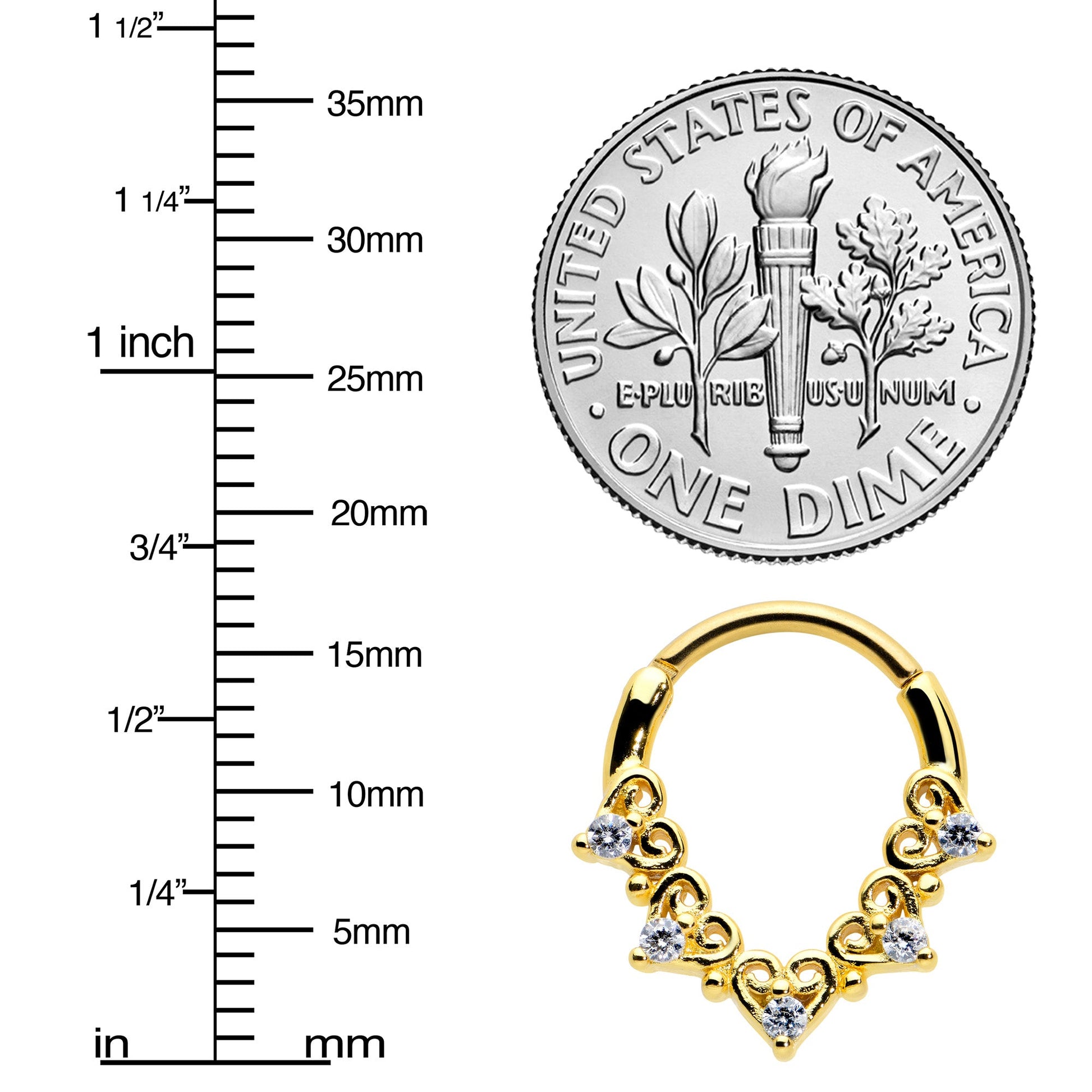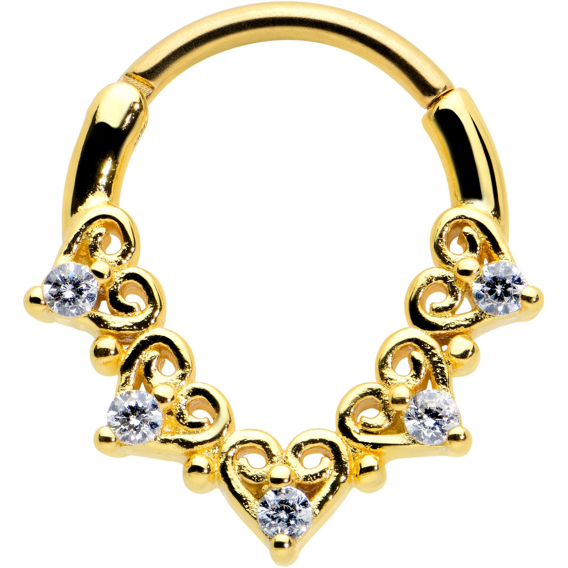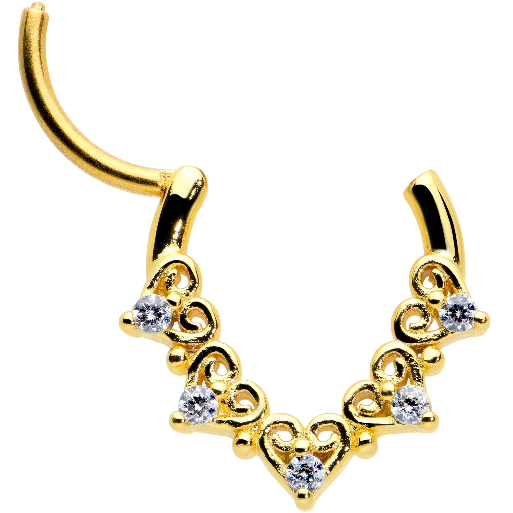 This 16 gauge cartilage jewelry is sure to steal your heart! It's made with a 10mm gold tone PVD over 316L surgical grade stainless steel hinged curved barbell. It features a drop shape, with the point at the center of the bottom curve. The bottom portion is made up of filigree hearts and each heart is set with a clear cubic zirconia gem for an added touch of style. It features a hinged, clicker design that makes insertion and removal a snap and you can rock it in multiple cartilage piercings like the daith, helix, and tragus. Why wear your heart on your sleeve when you can wear it on this elegant cartilage ring?Specifications