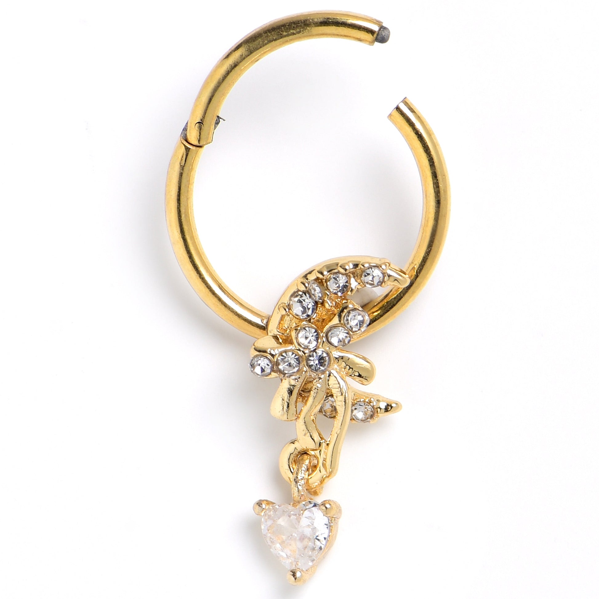 16G 3/8 Clear CZ Gem Gold Tone Moon Bow Heart Hinged Segment Ring