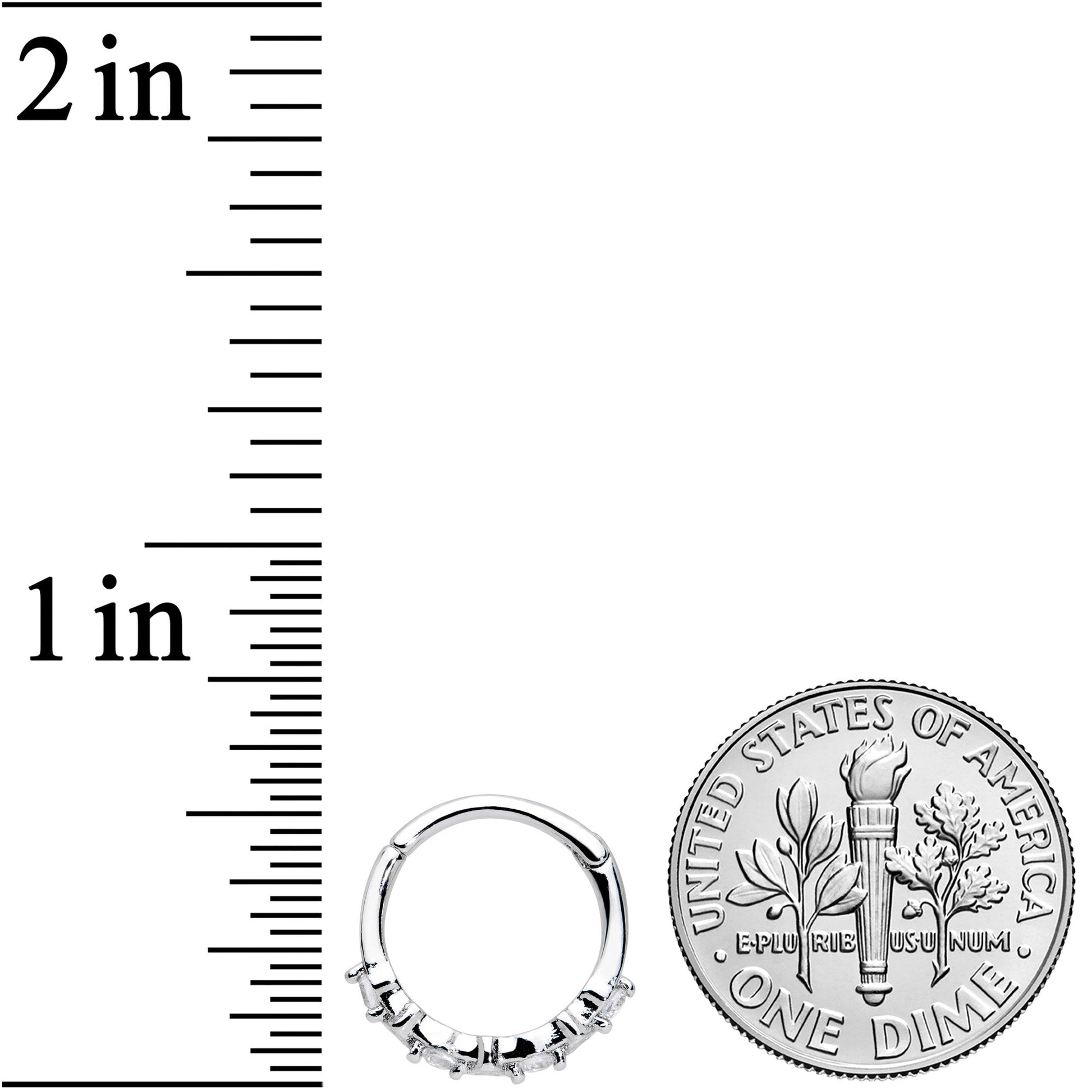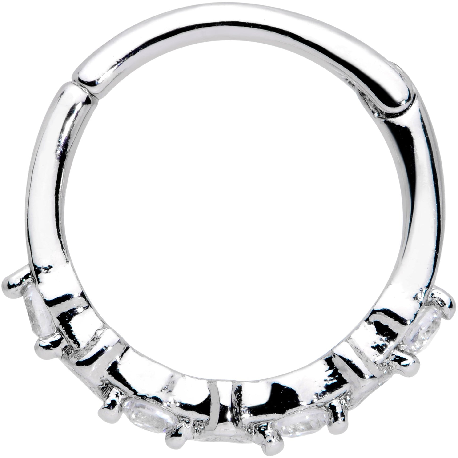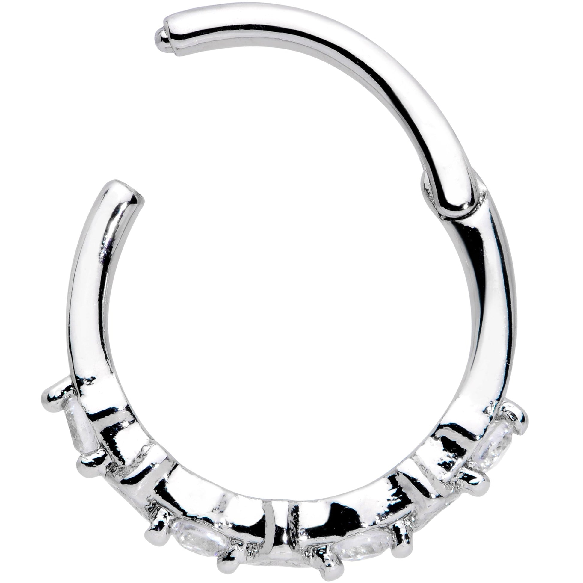 Have a heart and show your cartilage piercings some love with this 16 gauge cartilage ring! It's made with a 10mm durable 316L surgical grade stainless steel hinged circular ring. It features a row of forward-facing hearts, with clear cubic zirconia gems set between them. It also features a hinged, non-removable segment that makes insertion and removal a breeze. And it works perfectly in multiple piercings including the lip, eyebrow, daith, tragus, helix and some rook piercings! If you love your piercings with all your heart, show the world with this refined and romantic Valentine's Day cartilage earring!Specifications