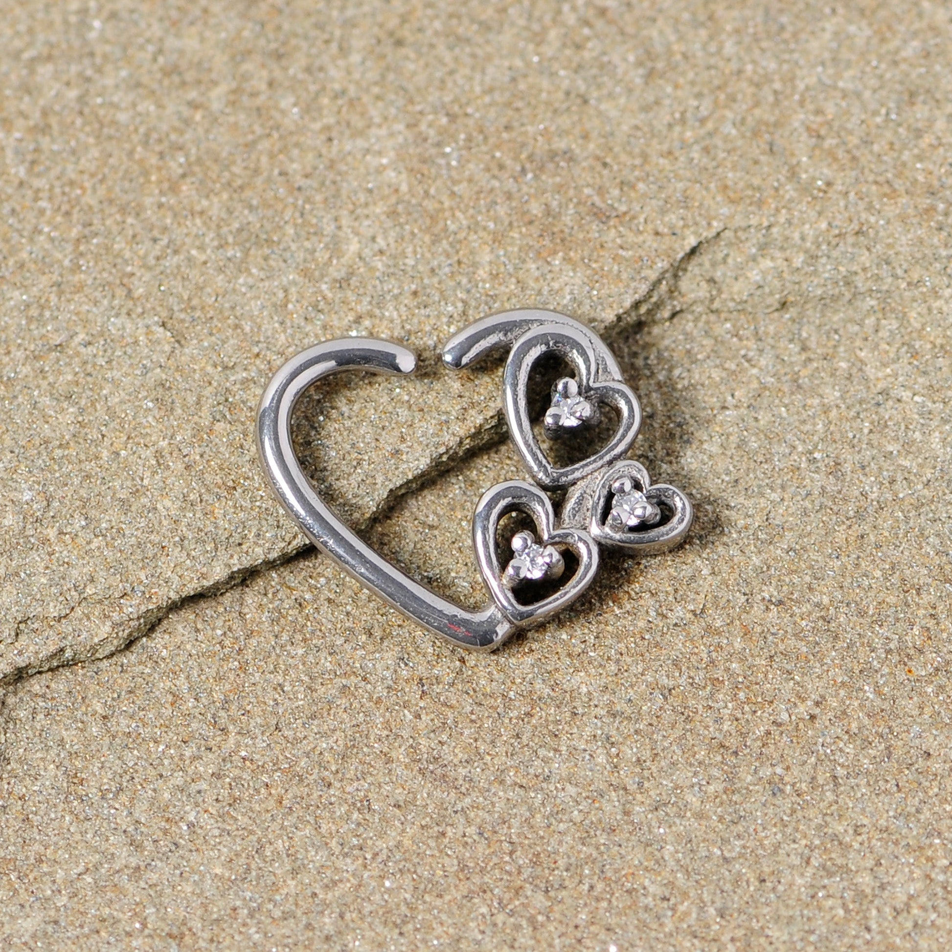 You're going to love this 16 gauge cartilage earring so much that you'll be seeing hearts everywhere! It's 10mm and made with 316L surgical grade stainless steel. The heart-shaped cartilage ring features a trio of smaller hearts, each one set with a clear cubic zirconia gem at the center. Designed to be worn in the left ear, this closure ring is super easy to insert and remove - just give it a light twist, insert it into your piercing and gently bend it closed. You'll love that because it works so well in multiple cartilage piercings including the daith, tragus, rook, and helix. You're sure to fall in love with all those options!Specifications