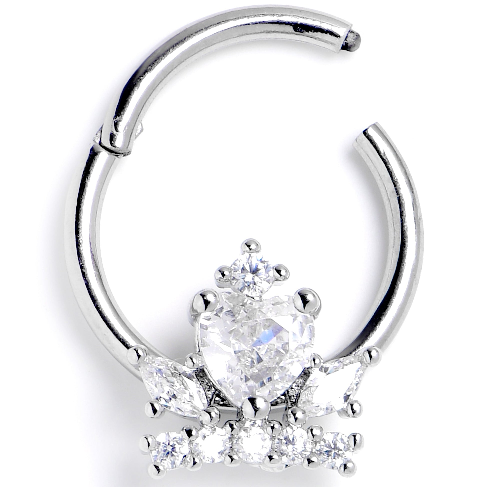 Crown your piercings in style with this elegant 16 gauge septum ring. It is made with a 10mm durable 316L surgical grade stainless steel hinged circular ring. It features a crown charm, composed of clear gems for a truly regal look. The center of the crown features a heart shaped clear gem for added style. It also features a non-removable, hinged segment that makes insertion and removal a breeze and you can rock it in multiple piercings including tragus, helix, and some daith piercings. Rock this regal crown and feel like the royalty you are with this elegant, aristocratic cartilage piercing jewelry.Specifications