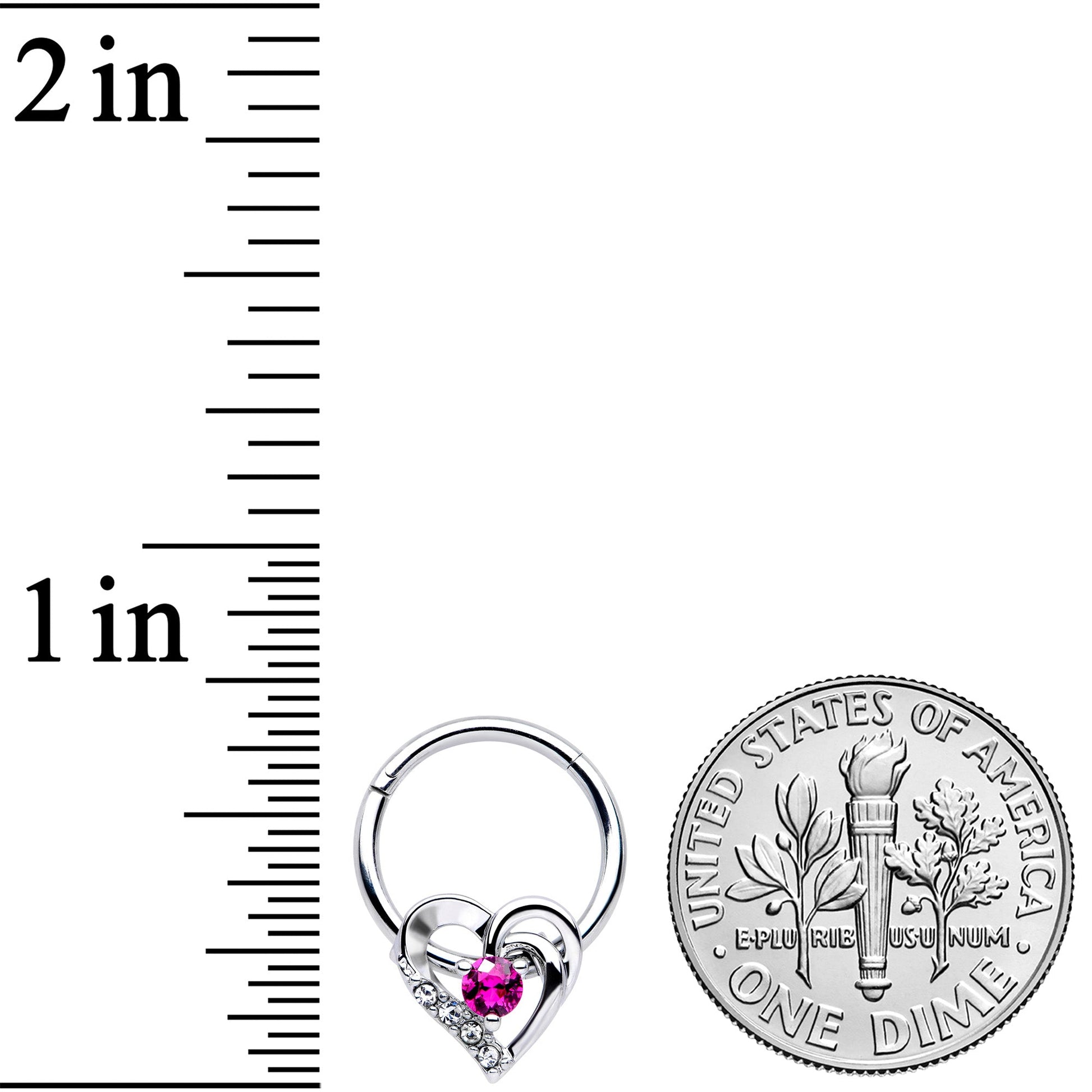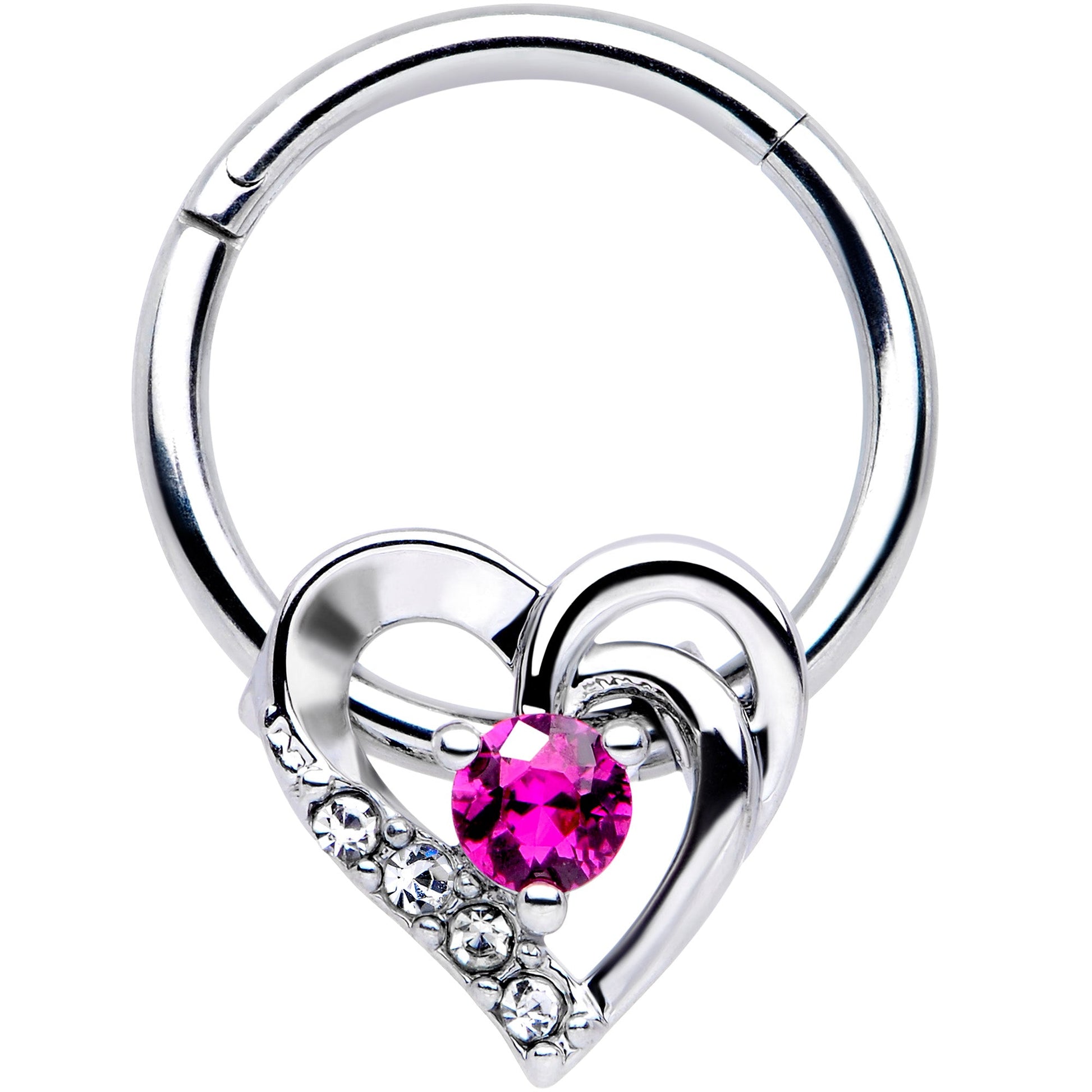 Valentine's Day can be every day if you keep it in your heart....like the heart on this 16 gauge cartilage ring! It's made with a 10mm durable 316L surgical grade stainless hinged circular ring and features a heart charm with one side composed of swirling openwork loops. The other side of the heart is set with clear gems for a balanced appearance. At the center of the heart is a round, hot pink gem that immediately catches the eye and adds a gorgeous splash of color to the piece. It also features a hinged, non-removable segment that makes insertion and removal a breeze. And you can splash that color in multiple piercings including cartilage piercings like the helix, tragus, daith and septum piercings too. Whether you're celebrating Valentine's Day, in love with love, or have a big heart to share, this handsome heart-themed cartilage jewelry is perfect for any occasion!Specifications
