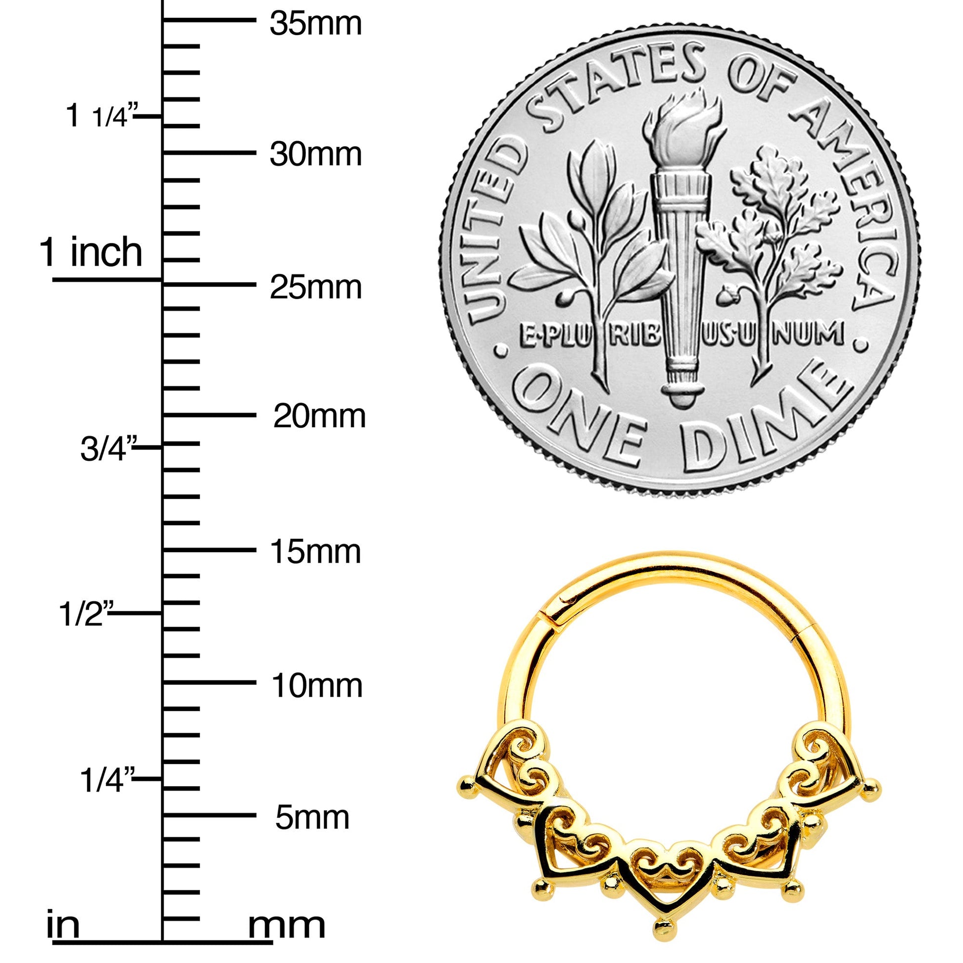 This 16 gauge septum ring is sure to steal your heart! It's made with a 10mm gold tone PVD over 316L surgical grade stainless steel hinged circular ring. It features a bottom portion that's made up of filigree hearts with understated style and simple detailing. It also features a hinged, non-removable segment that makes insertion and removal a breeze and you can rock it in multiple cartilage piercings like the daith, helix, and tragus. Why wear your heart on your sleeve when you can wear it on this elegant cartilage ring?Specifications