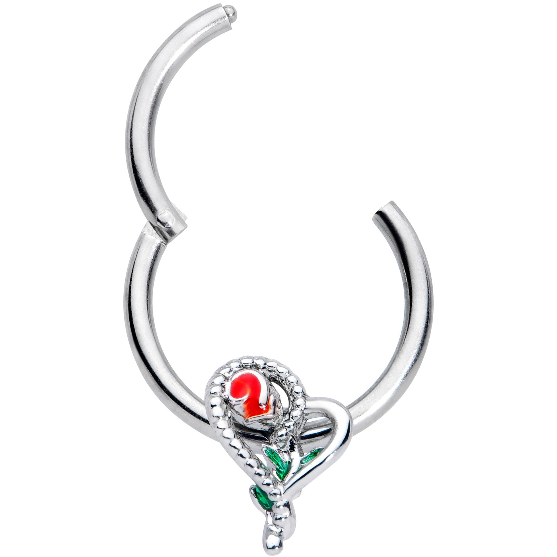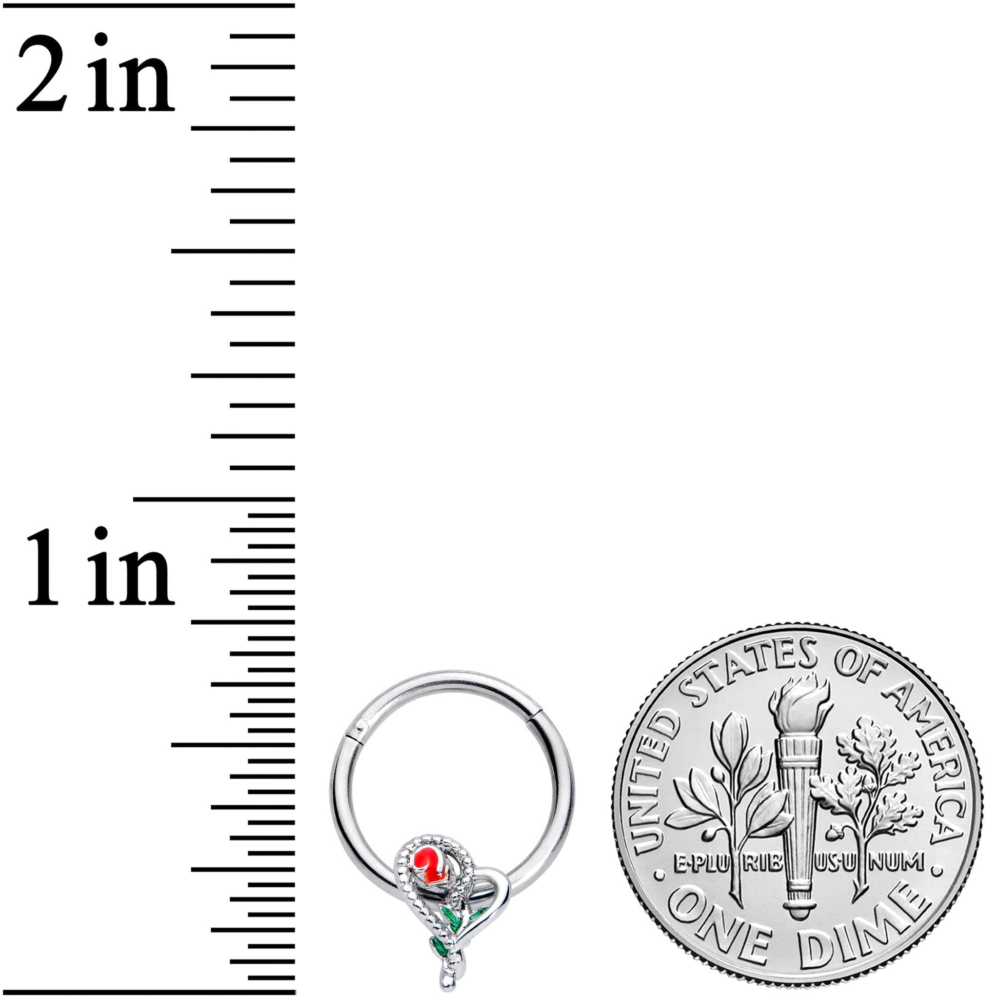 This 16 gauge cartilage jewelry is sure to slither its way into your heart this Valentine's Day! It's made with a 10mm durable 316L surgical grade stainless steel hinged circular ring. It features a snake charm with realistically textured detailing and a green gem eye and an openwork heart with a rose. The cartilage ring also features a hinged, non-removable segment that makes insertion and removal a snap. You'll especially love that because it works so well in multiple piercings including your septum as well as cartilage piercings like the helix, tragus, rook, and daith. This Valentine's Day, let this snake fill your heart as it fills your piercings!Specifications