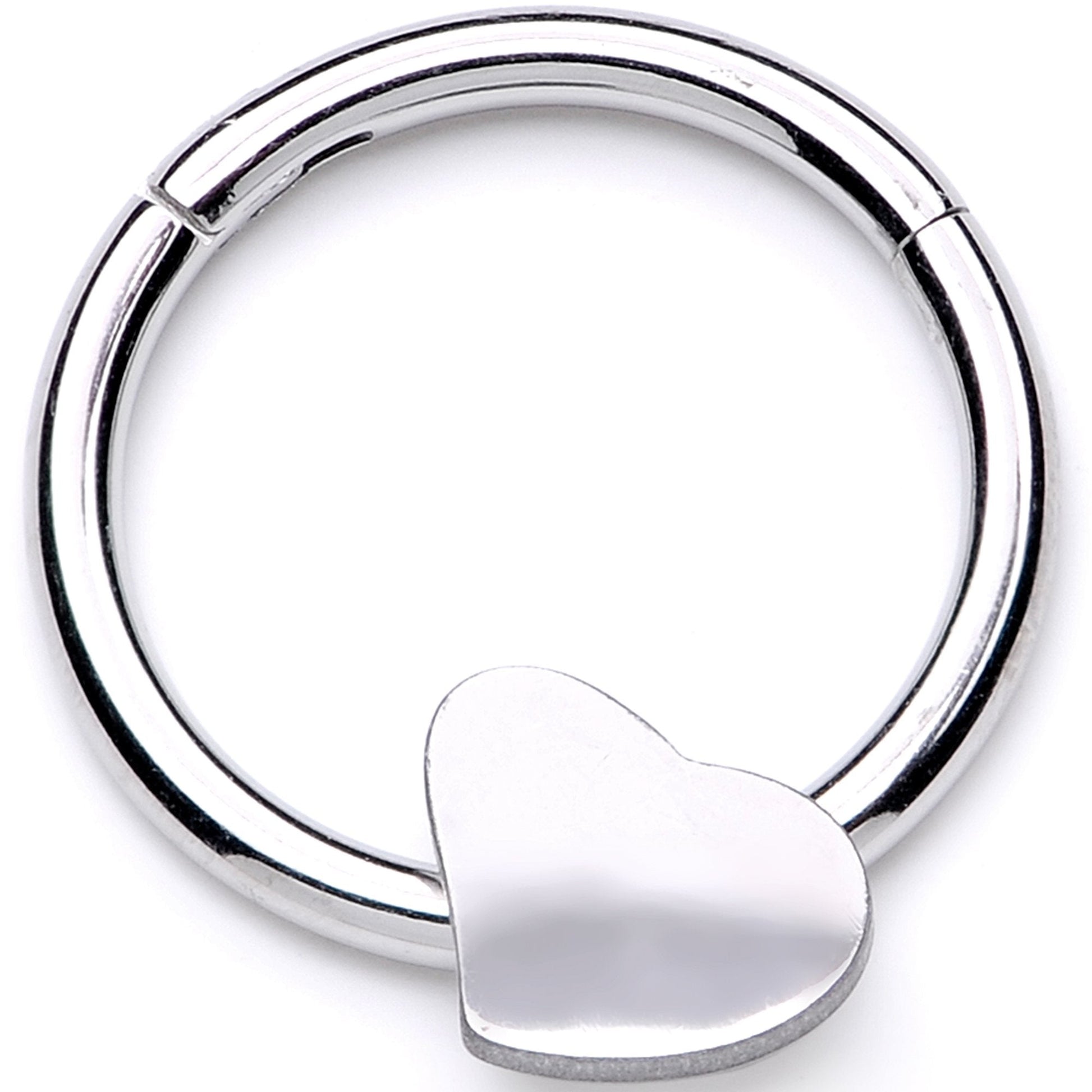 Show your piercings some love and show the world you love your piercings with this 16 gauge cartilage ring! It's 10mm and made with a durable 316L surgical grade stainless steel hinged circular ring. The ring features a stylized, asymmetrical heart embellishment. It adds just a touch of whimsy to the piece while still keeping it very simple so as not to be overwhelming. The ring has a non-removable hinged segment that makes it super easy to insert and remove. That's another thing to love because it works well in multiple piercings including the septum, daith, tragus, and helix. You gotta love it!Specifications