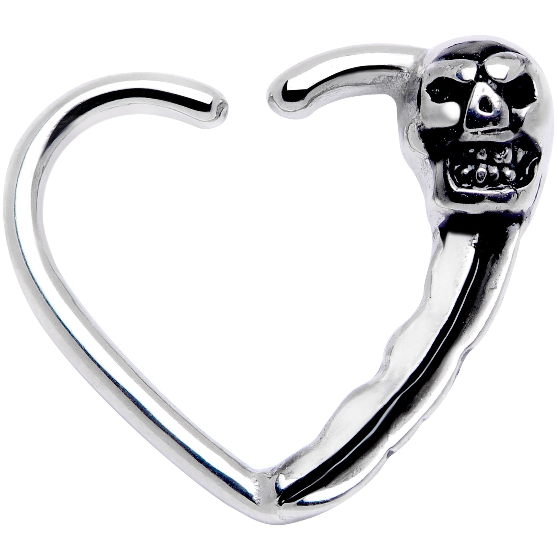 Show your love for this spooky skull with this 16 gauge heart-shaped cartilage earring. It's 10mm and made with 316L surgical grade stainless steel. It features a three-dimensional skull in the top outer corner and embellishment down the side for extra visual interest. This ring is made for a left ear piercing. It's also super easy to insert and remove - simply twist the ring open, insert, and then twist gently shut again. You'll love this feature because this works so well in multiple piercings including cartilage piercings like the daith, helix, tragus, and more. So have a heart - show our little skull some love!Specifications