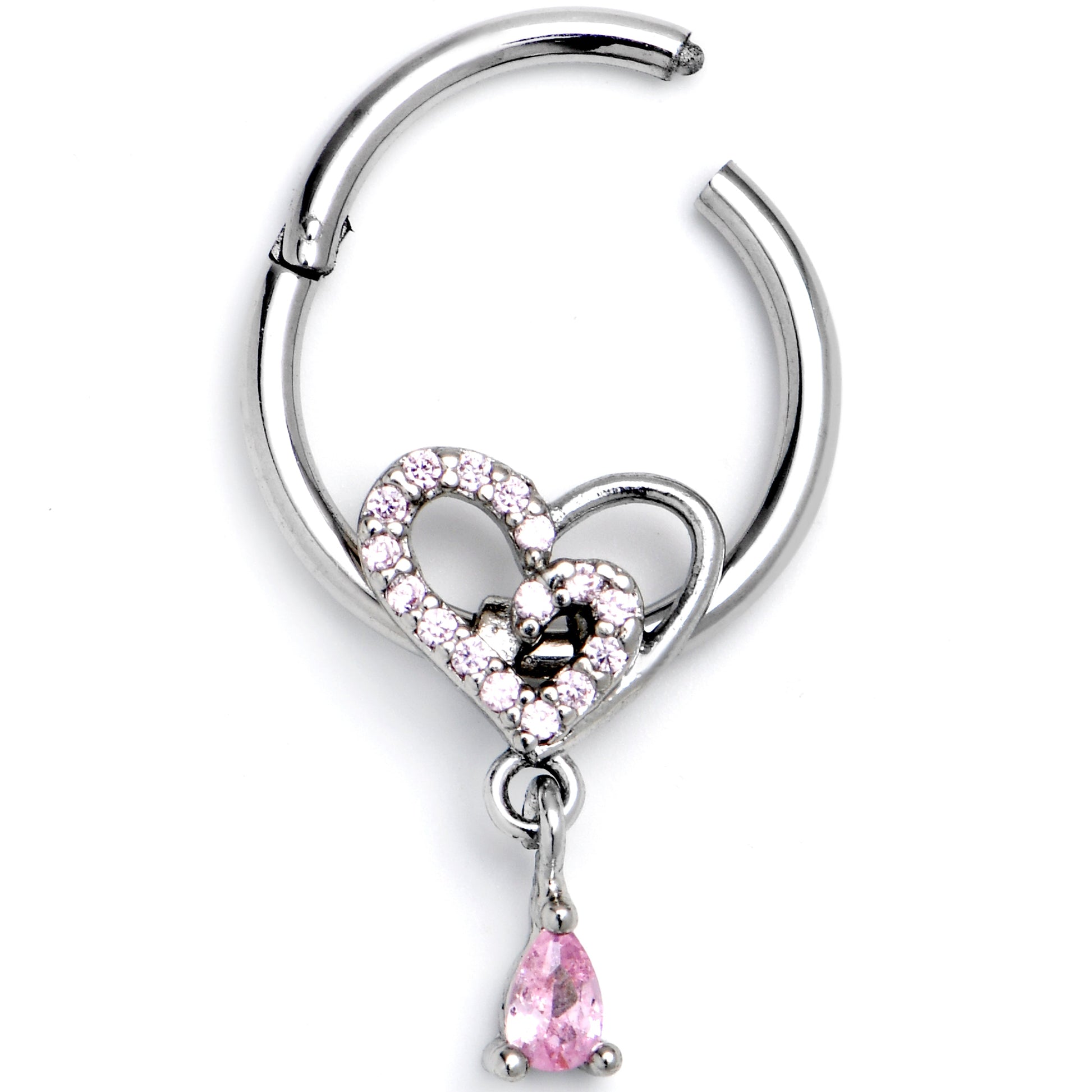 Keep style on your side when you fall in love with this 16 gauge septum ring. It is made with a 10mm durable 316L surgical grade stainless steel hinged circular ring. It features a heart charm, with one side paved with pink cubic zirconia gems while the other side is unadorned for simple, asymmetrical style, and there is a pink cubic zirconia gem dangle for added motion. It also features a non-removable, hinged segment that makes insertion and removal a breeze and you can even rock it in multiple piercings including tragus, helix, and some conch piercings. Get ready to love this opulent cartilage piercing ring.Specifications