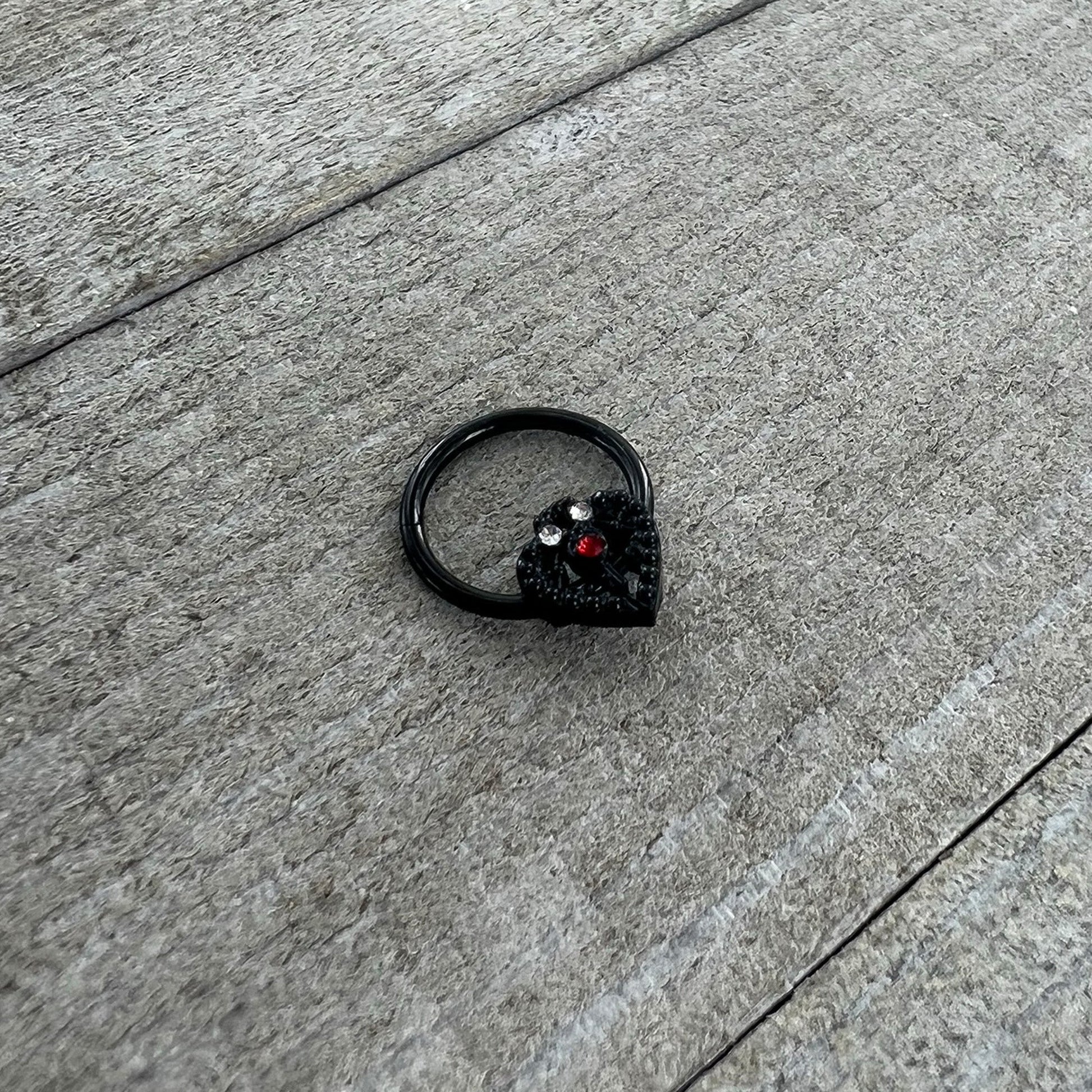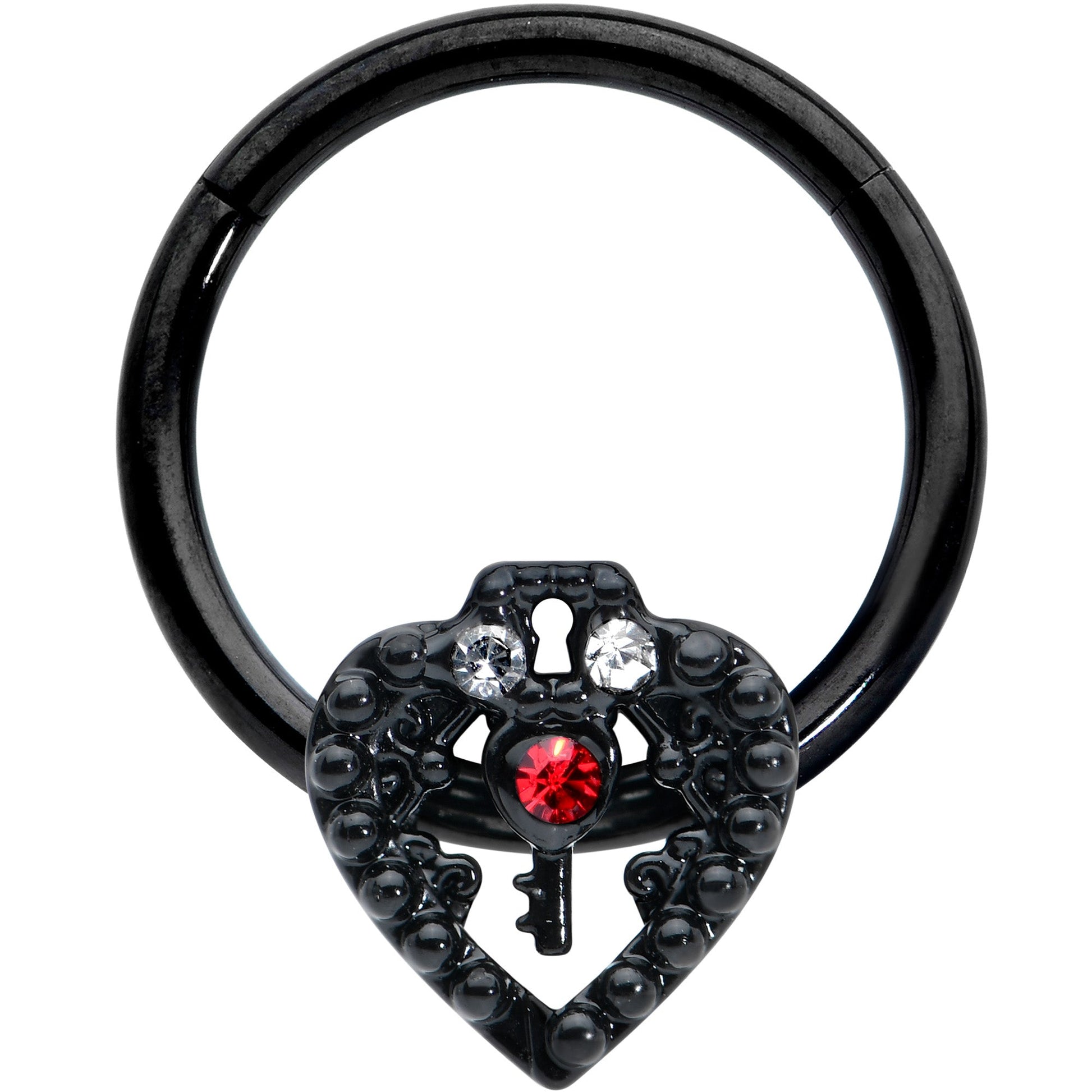 Unlock gothic style with this 16 gauge septum ring! It's made with a 10mm black PVD over 316L surgical grade stainless steel hinged circular ring. It features a heart charm, set along the top curves with clear gems. At the center point of the heart is a key, set at the top with a red gem for a truly striking color contrast. It also features a non-removable, hinged segment that makes insertion and removal a snap and you can even rock this key in multiple piercings including tragus, helix, and some daith piercings. You're going to love this darkly elegant cartilage piercing ring with all your heart!Specifications