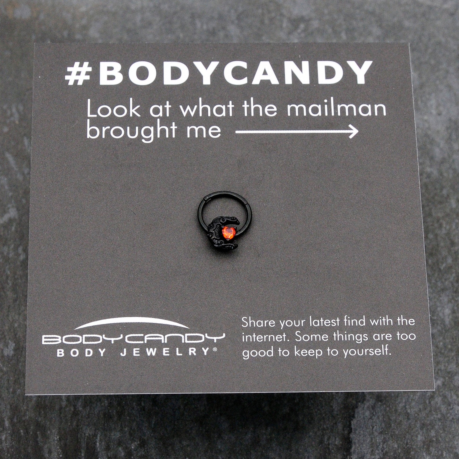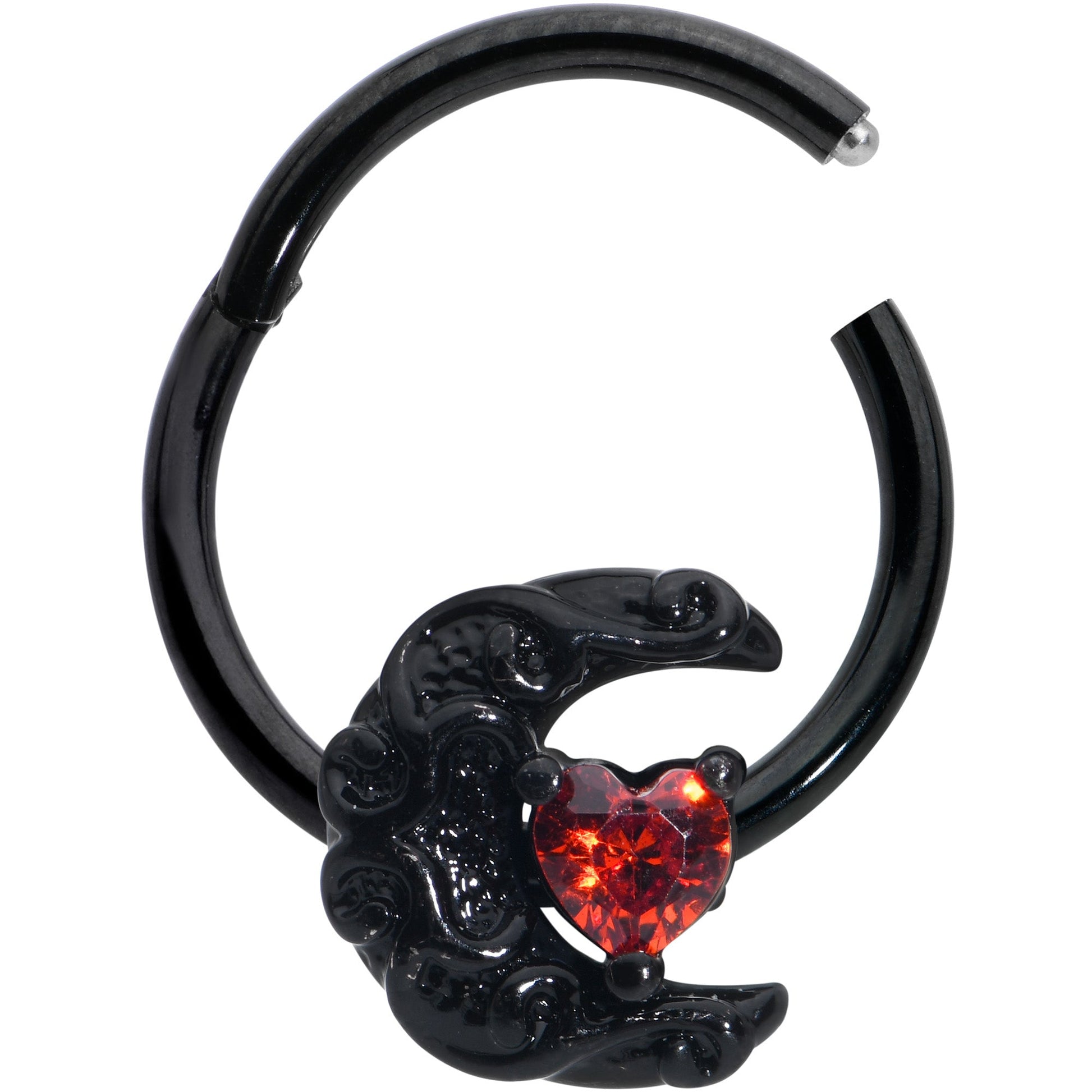 Fall in love with the lunar look of this with this 16 gauge septum ring. It is made with a 10mm black PVD over 316L surgical grade stainless steel hinged circular ring. It features a crescent moon charm, covered in raised scrollwork embellishment. At the center of the moon is a heart, composed of a red cubic zirconia gem. It also features a non-removable, hinged segment that makes insertion and removal a breeze and you can even rock this moon in multiple piercings including tragus, helix, and some daith piercings. You will rule the evening sky with this elegant celestial cartilage piercing ring.Specifications