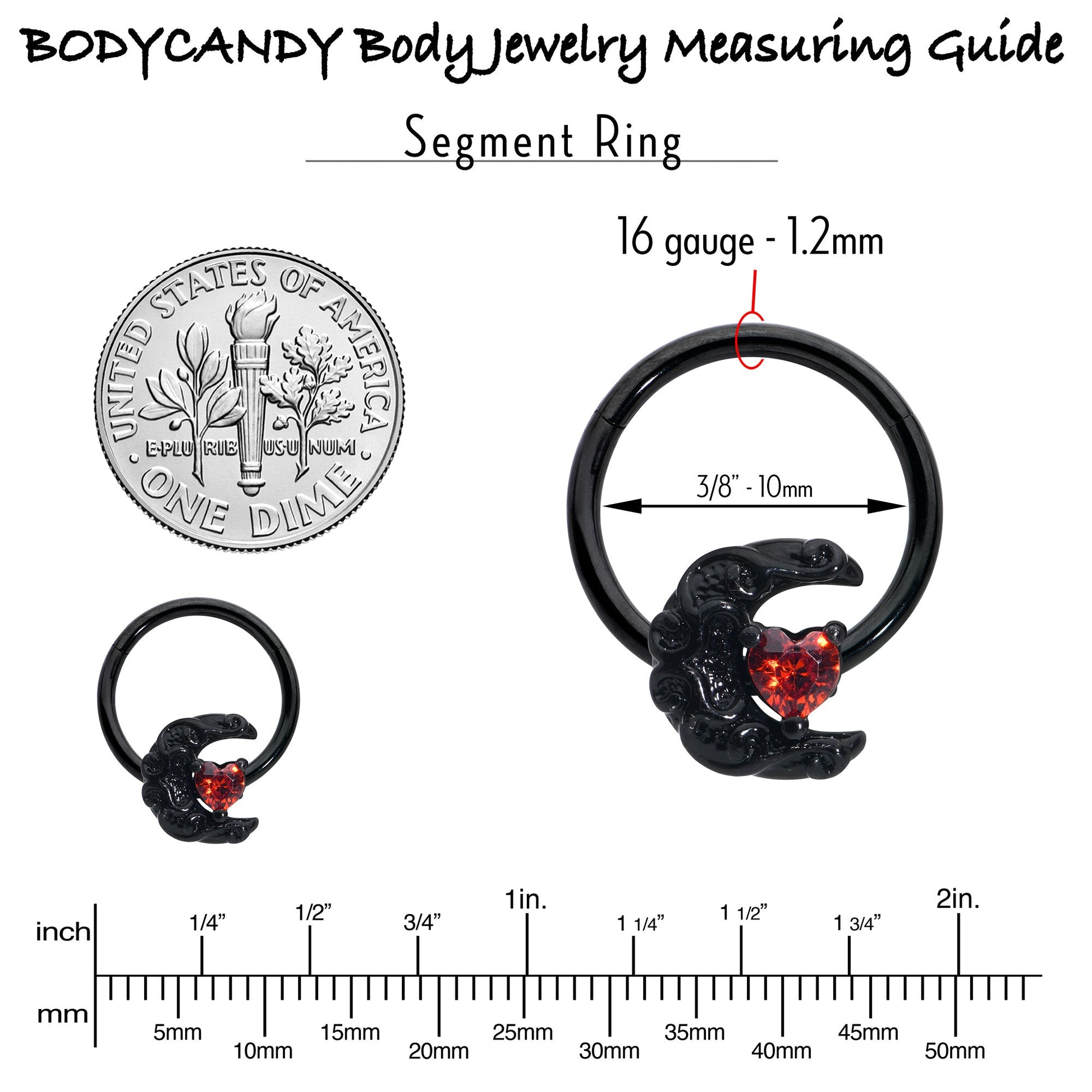 16 Gauge 3/8 Red CZ Gem Black Scroll Moon Heart Hinged Segment Ring