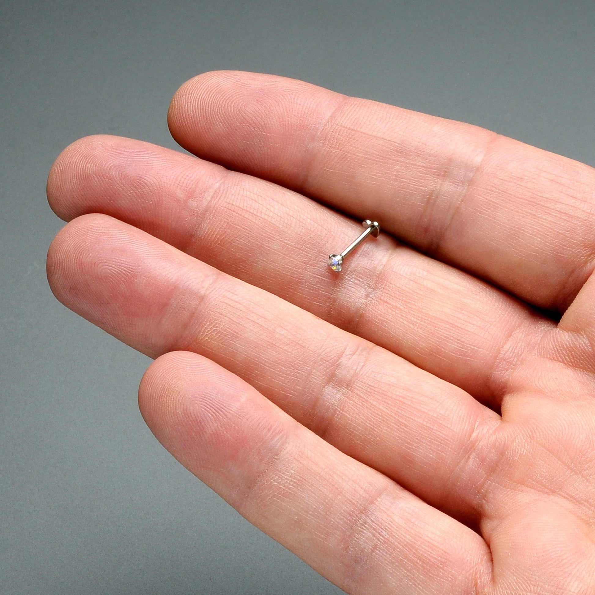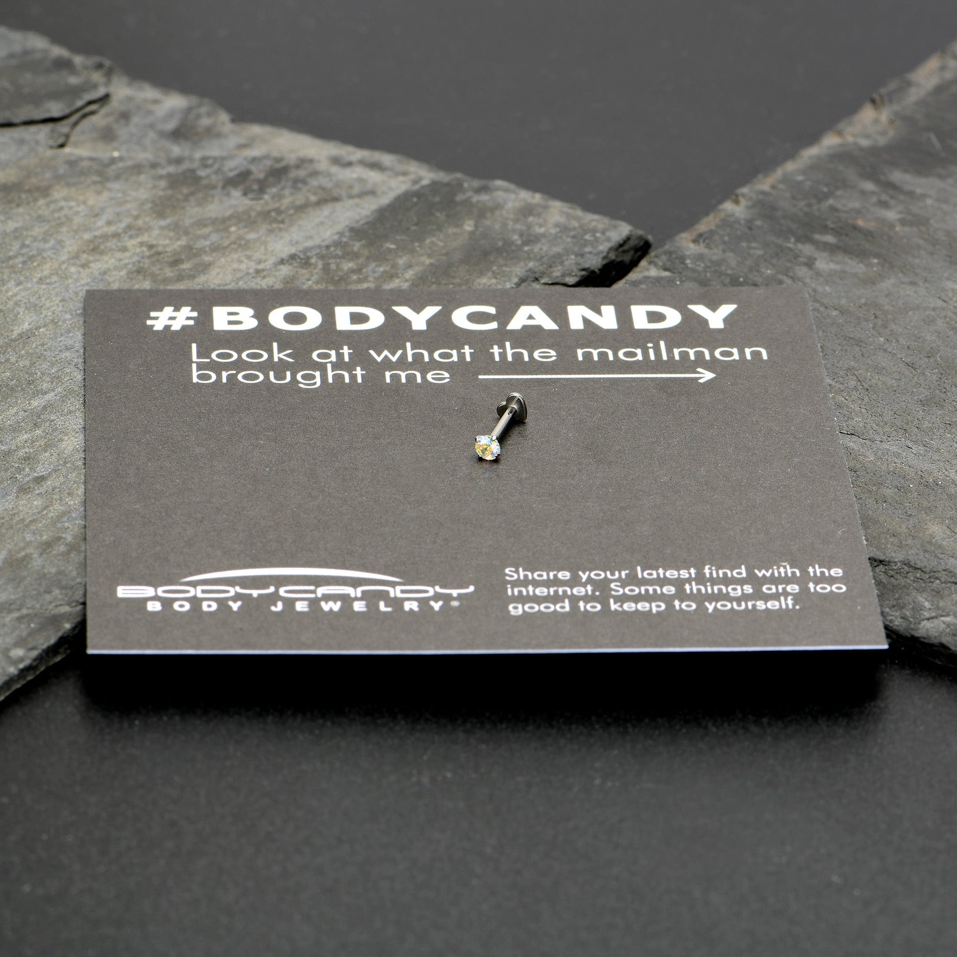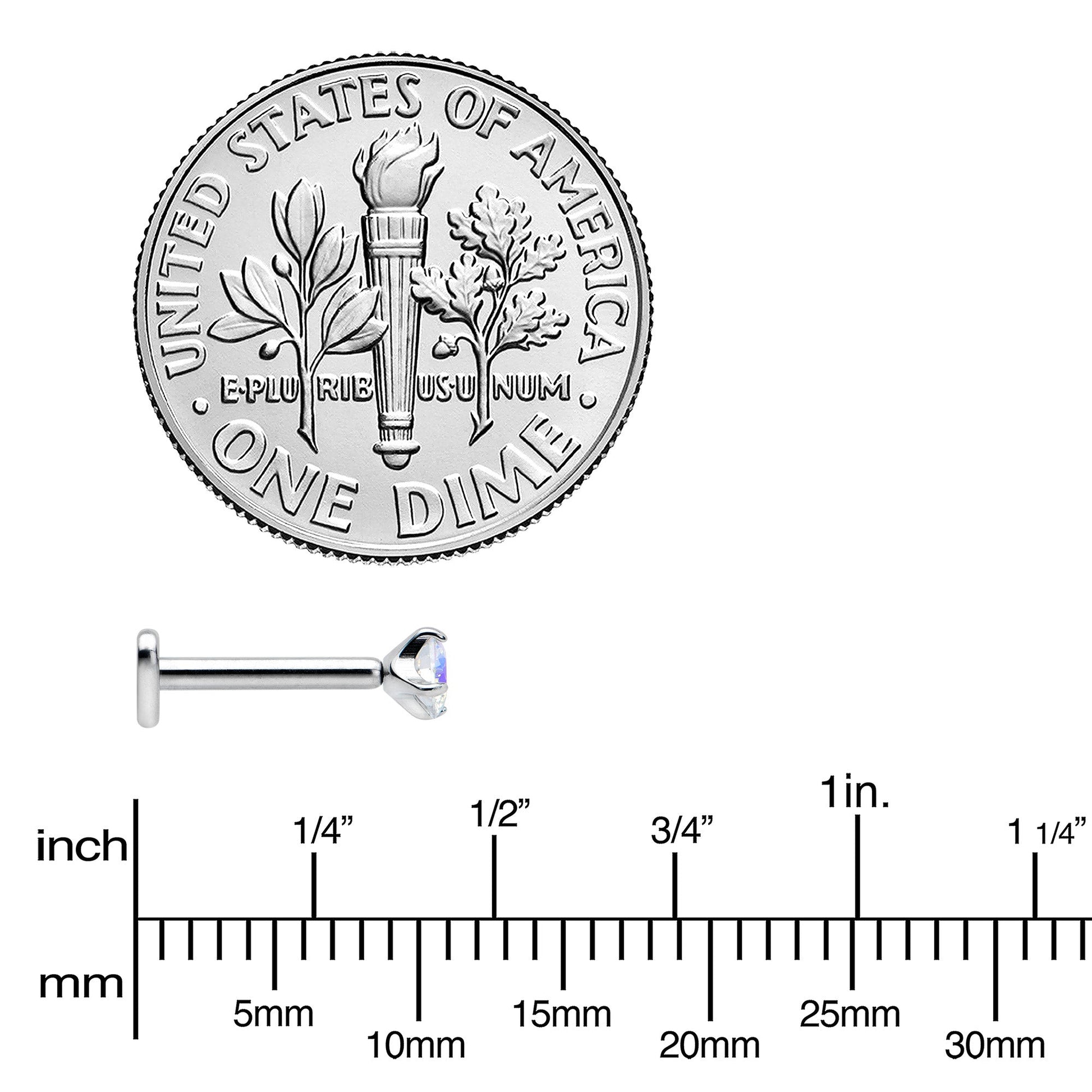 Your cartilage piercings will have twice the style with this 16 gauge lip ring! It's made with an 8mm ASTM F-136 titanium straight post. The front end features an aurora cubic zirconia gem in a pronged setting and a threadless design that makes insertion and removal a snap! The back end features a heart shape, for a charming change from the standard disc shape. You can even rock this jewelry in multiple piercings including lip, monroe, tragus, helix, and some conch piercings. With such an endearing style and such thoughtful details, this is one cartilage ring you'll never want to remove!Specifications