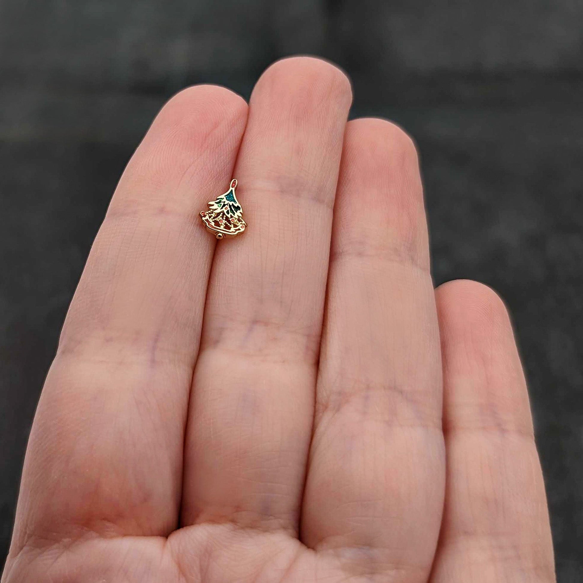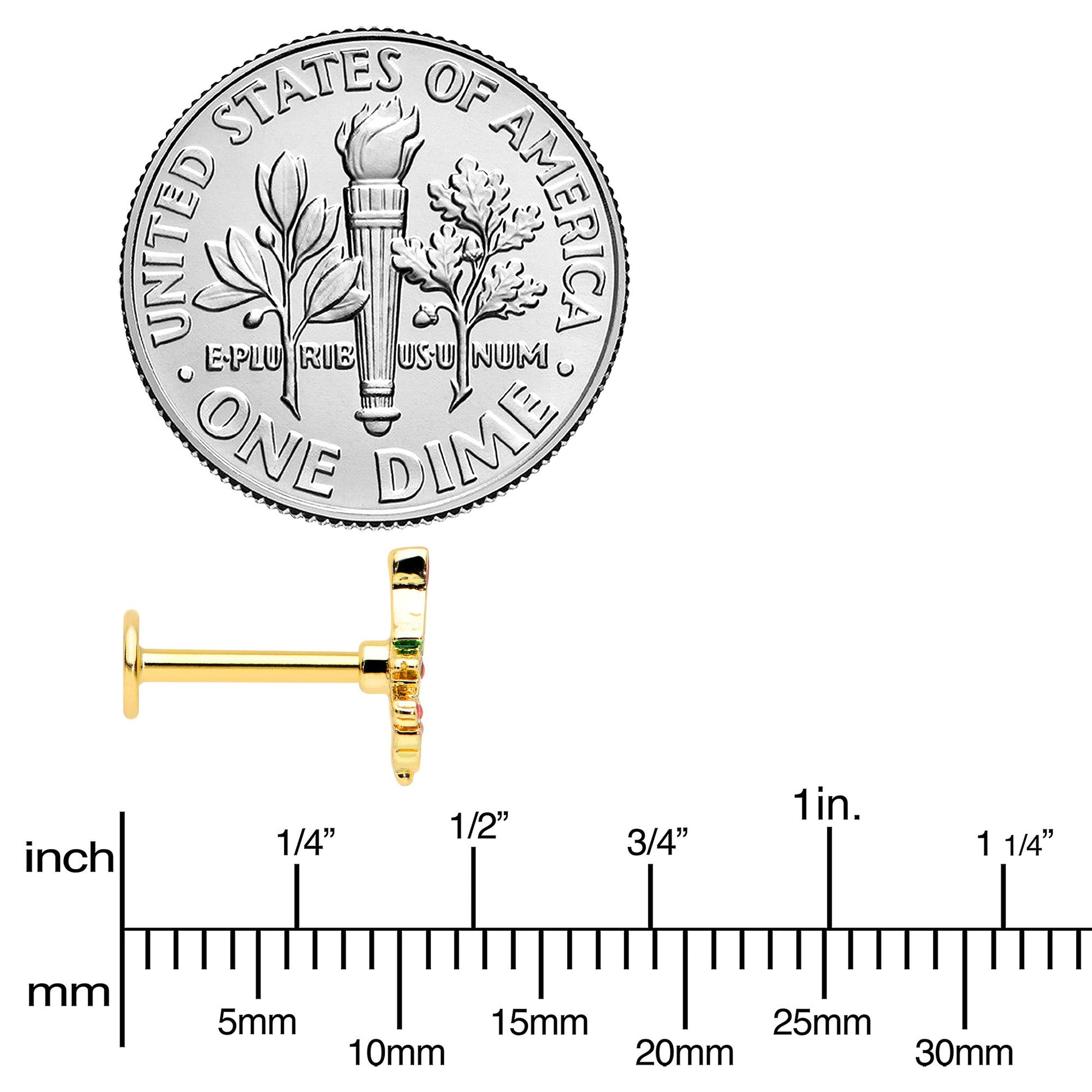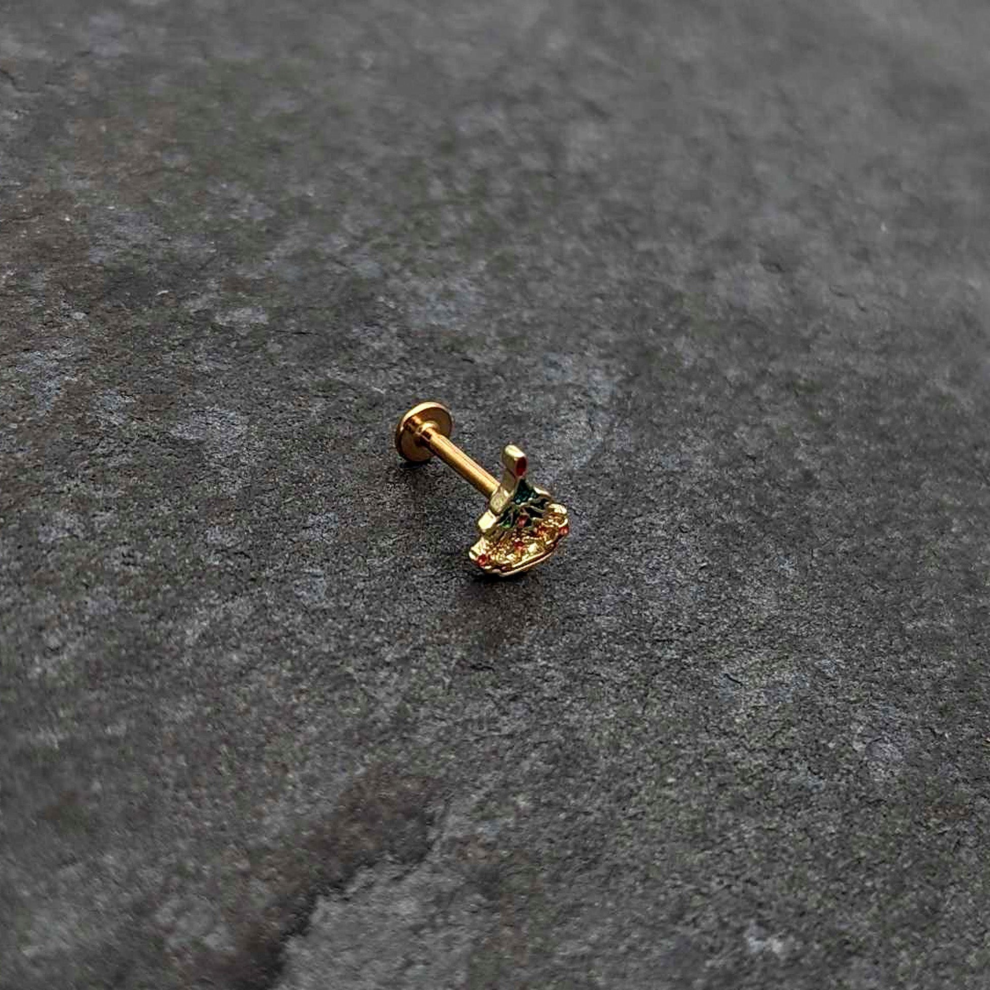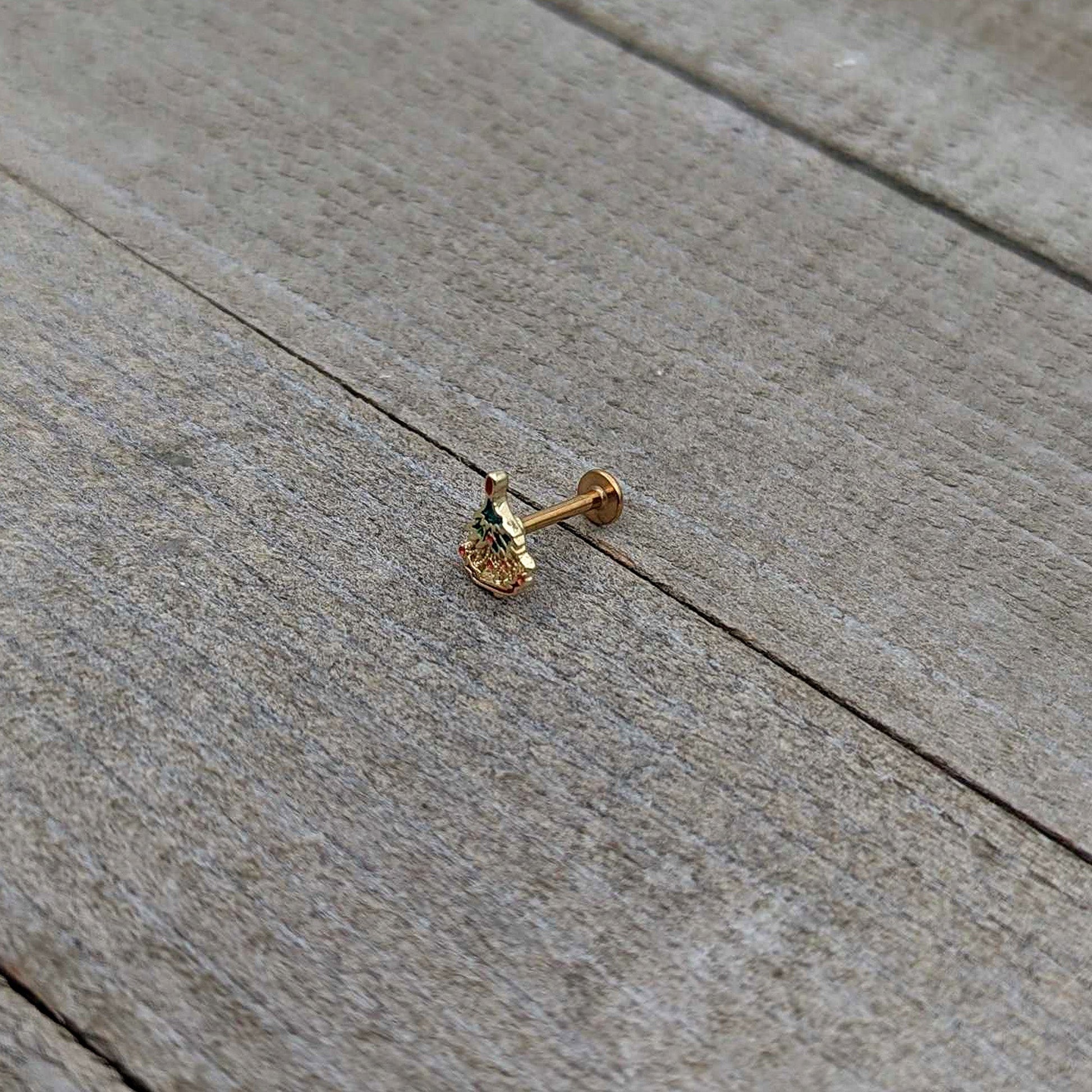 Deck your piercings with this 16 gauge lip ring! It's made with an 8mm gold tone PVD over 316L surgical grade stainless steel straight post with a flat disc end. It features a festive Christmas tree, with green and blue inlay. It's further embellished with red gem orbs and a red gem inlaid star on top. You can rock this tree around multiple piercings including lip, monroe, tragus, helix, and some conch piercings. You'll be feeling fabulous and festive when you're rocking this Christmas cartilage jewelry around!Specifications