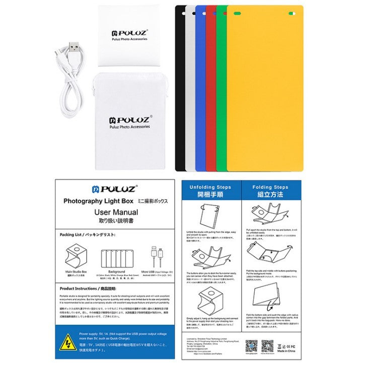 characteristics 100% Brand new! all-in-one portable studio, easy to use & take apart. the photo lightbox is designed for small items of photography enthusiasts, artisans, artists, students and other online sellers, professionals and product advertising clients. studio light box allows quick and easy shooting of small products such as jewelry, accessories, toys, watches, appliances and other items. set up your own photography studio anywhere in a matter of minutes, you can unfold this has taken light studio box and put it on any surface to get the perfect setting for small business photography articles, take pictures for them. portable snap button snap frame design, easier to install and carry, built-in led light, medium light supply and prevents shadows and reflections on your photos. with 6 EVA bottoms (Black, white, orange, red, green, blue), and internal LED light panel and USB cable (you should prepare a USB charger, power bank, or USB hub to power it ). Mini and light weight, just like a book when folded, easy to take anywhere. specifications ShellMaterial: PVC Scenarios Material: EVA, non-woven Shell Color: White Color temperature: white Fresh, 2 * 5600 K Light source: 2 LED panels with 2 * 20 pcs beads on it bright: About 2 * 550 lumens Power Source: USB 5 V port: Micro USB, universal Android device port Rated Power: 2 * 3.5 W Size of the tent: About 24x23x22 cm / 9.4x9x8.6 "(unfolded) 23x23x1.5 cm / 9x9x0.59 "(folded) attention please wait 3-5mm size deviations due to manual measurement. Package Included 1 x Main Studio Box (with 2 LED panels) 1 x Round PVC Plate 1 x Soft Bag 6 x EVA Scenarios (6 different colors) 1 x Micro USB Cable 1 x User Manual