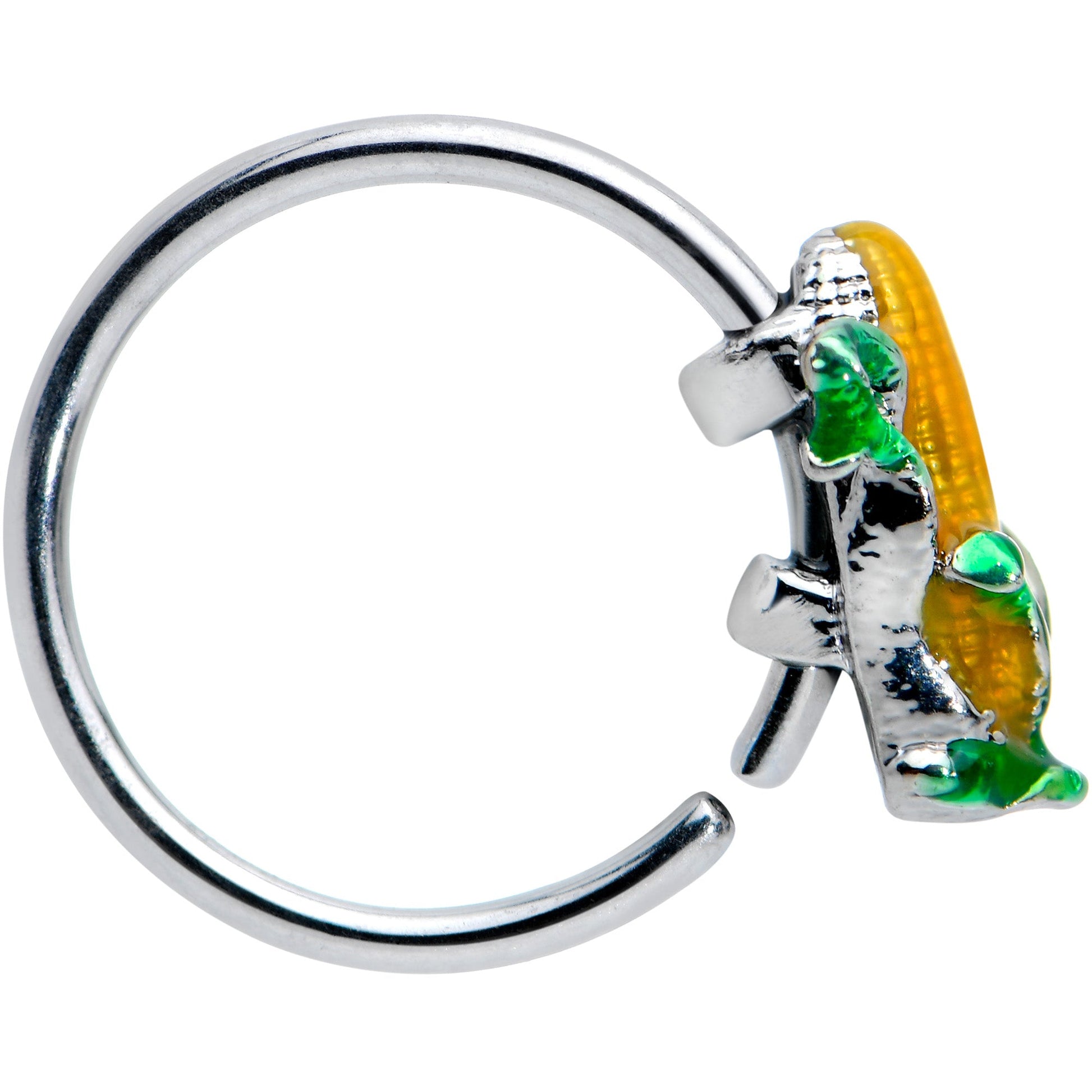 There's nothing corny about this 20 gauge nostril ring! It's made with an 8mm durable 316L surgical grade stainless steel circular ring. It features a corn charm, with detailed cob and husk. Get ready for barbecue season, this corn is ready to go on this summer themed nose piercing jewelry!Specifications