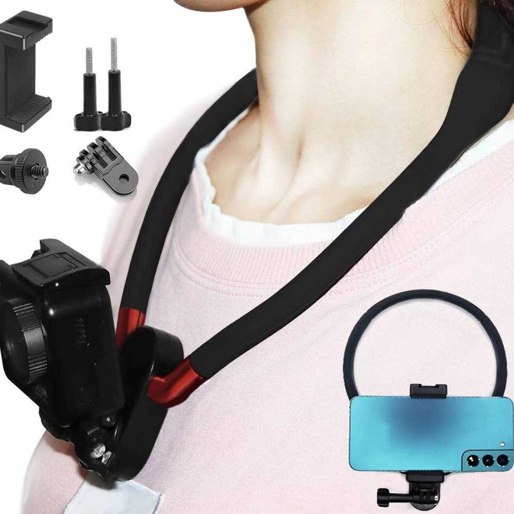 - Upgraded Design: The camera mount neck brace is made of Silicone Material soft and cozy for touching, with no wearing pressure. And can rotate and switch angles, so you can control or watch mobile phones & camera screens more conveniently, and unlock the first view. Just hang on the chest, you can shoot and record video with hands free.