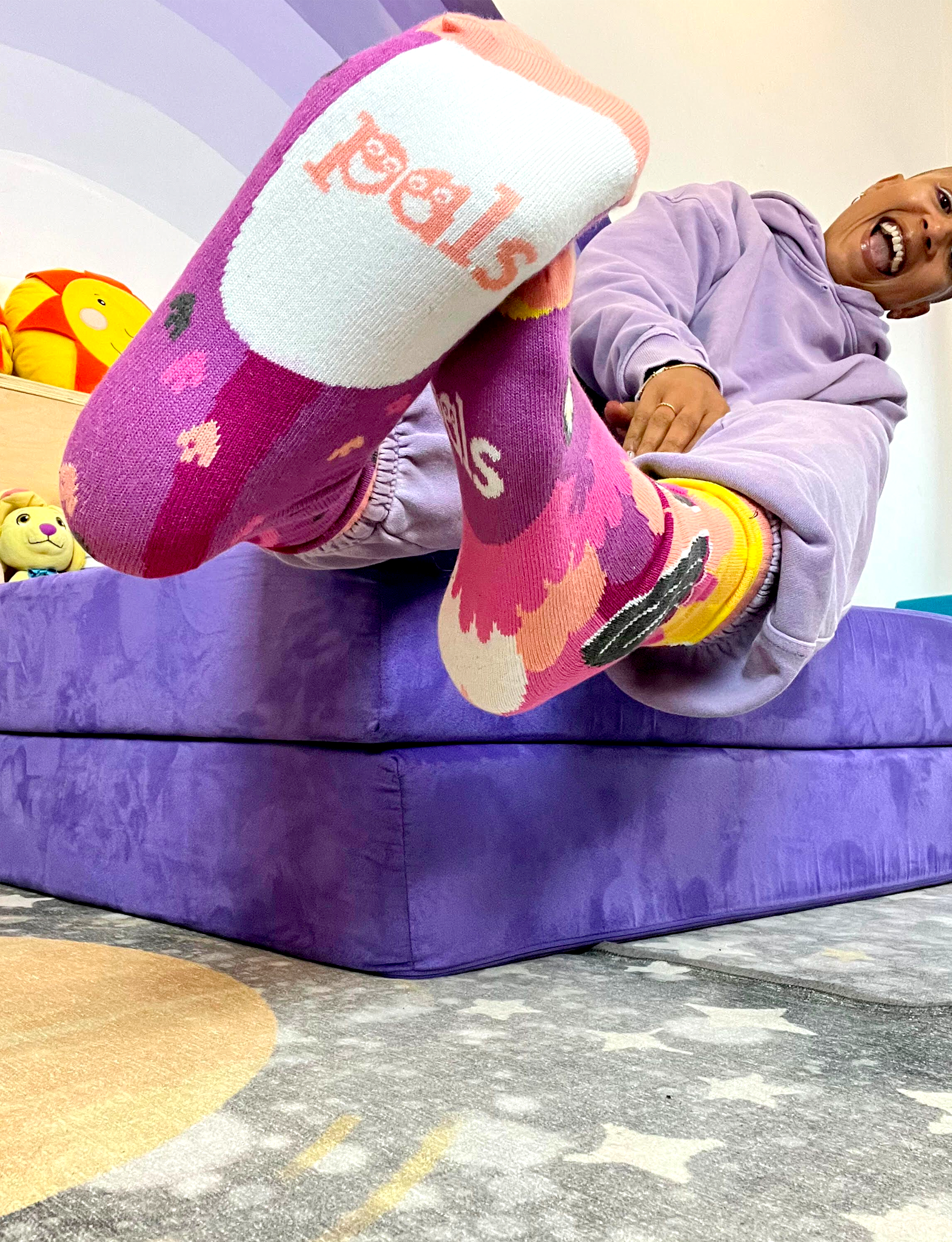 Meet cute and cheerful nocturnal besties, Owl and Mouse! These purple and pink mismatched animal socks are from the Pals Originals Collection. |