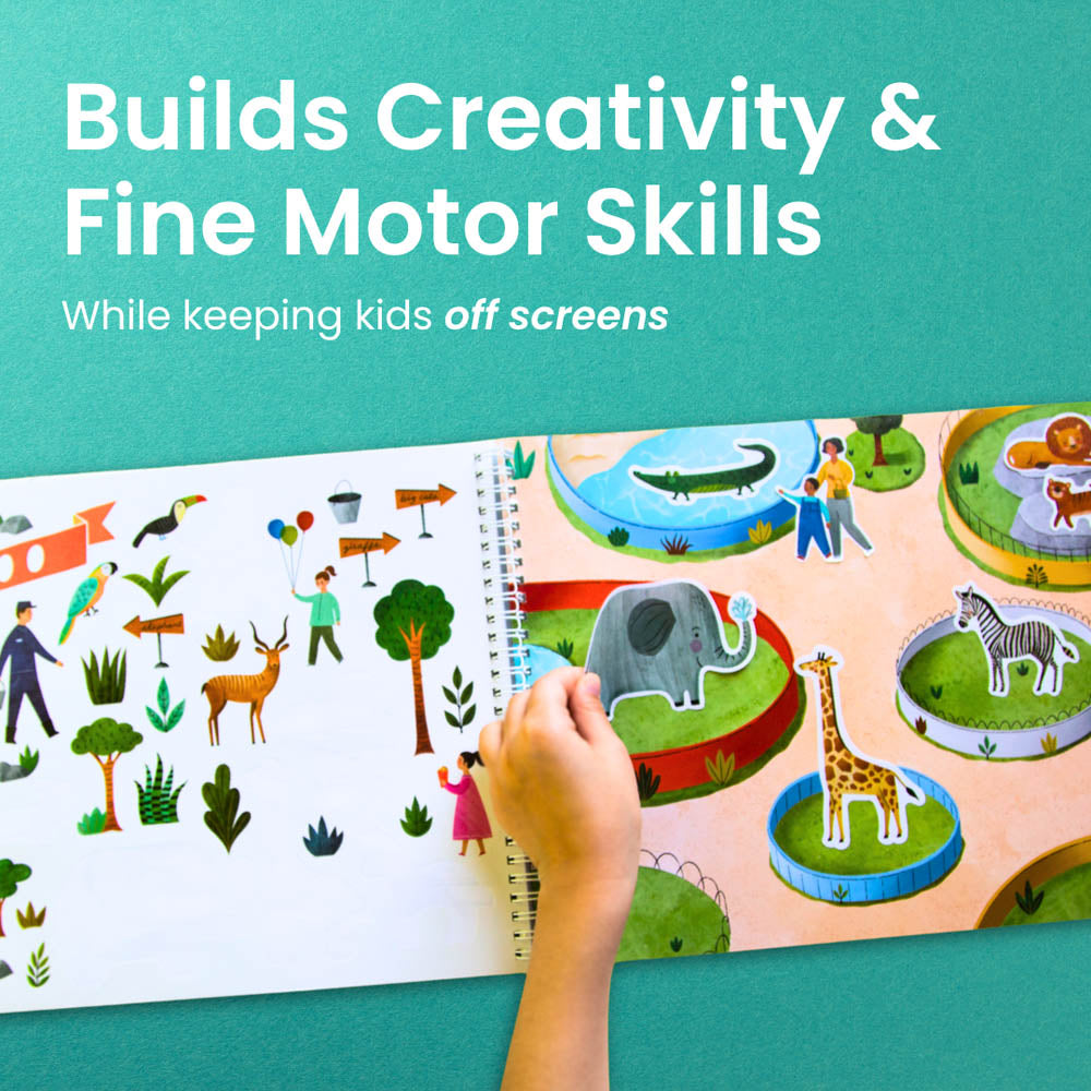 - 12 mini activities with 500+ stickers to create educational learning experiences all around the town. Kids will get to see a bunch of places around town and exercise their fine motor skills to build their own scene from scratch.