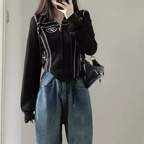 Black Zipper Coat Women's High-grade Slim-fit Hood Top