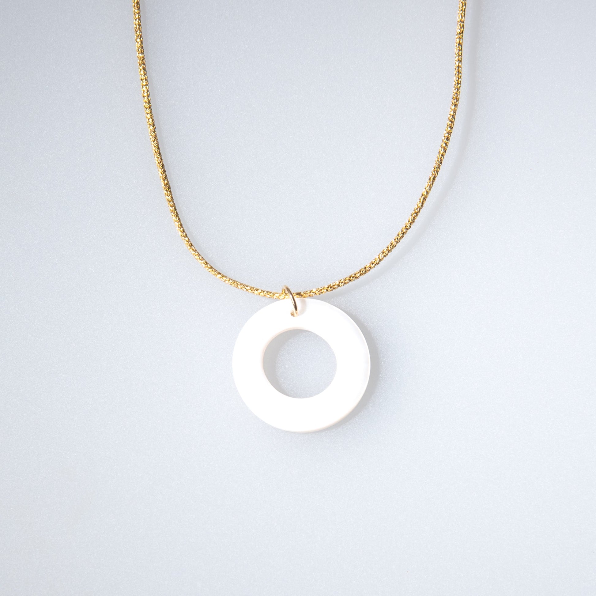 A Mother of Pearl circle pendant attached to a gold-threaded necklace