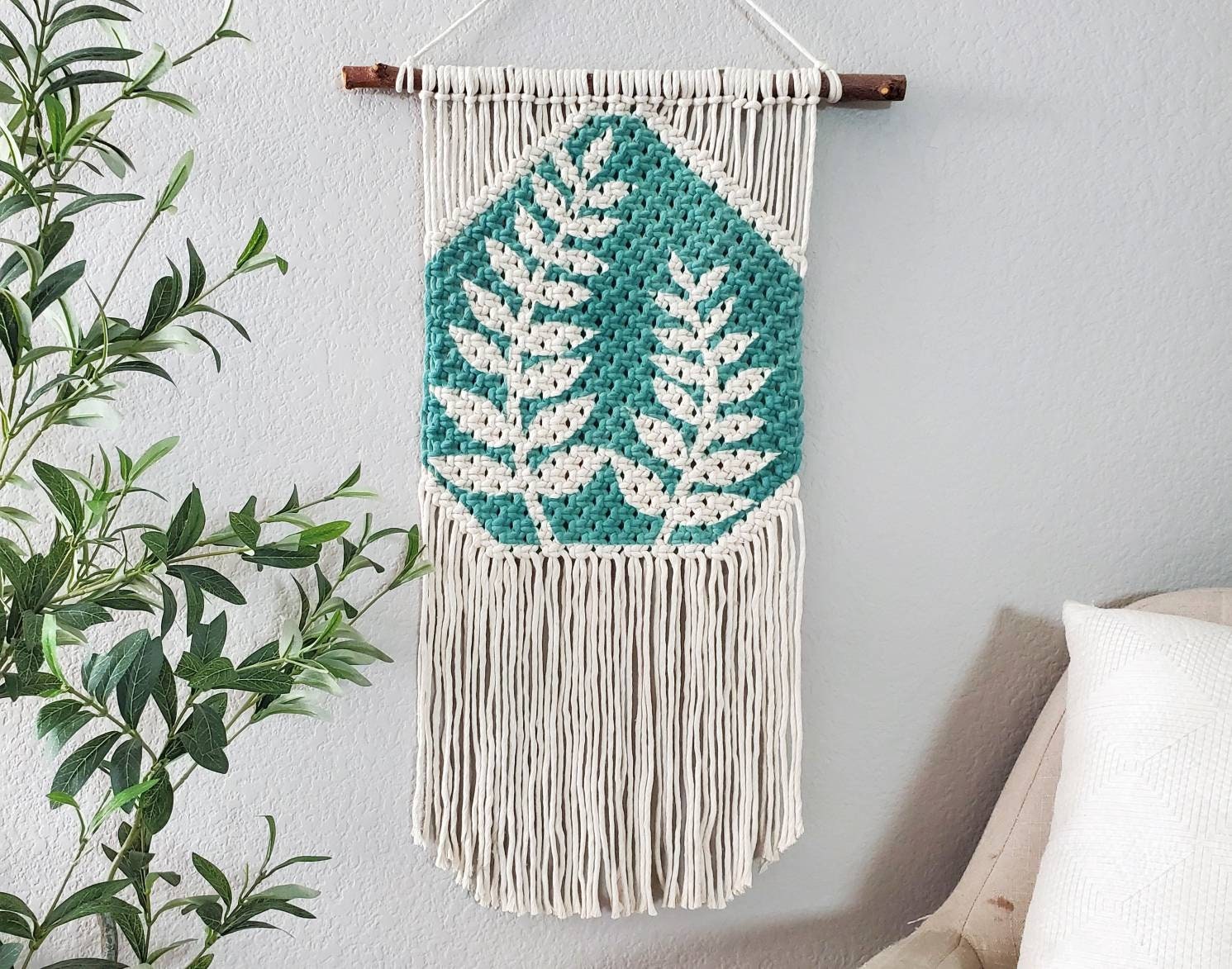 Bring an elegant and stunning new vibe to your home with this one of a kind handmade, hand painted macrame wall hanging on a beautiful natural wooden branch.