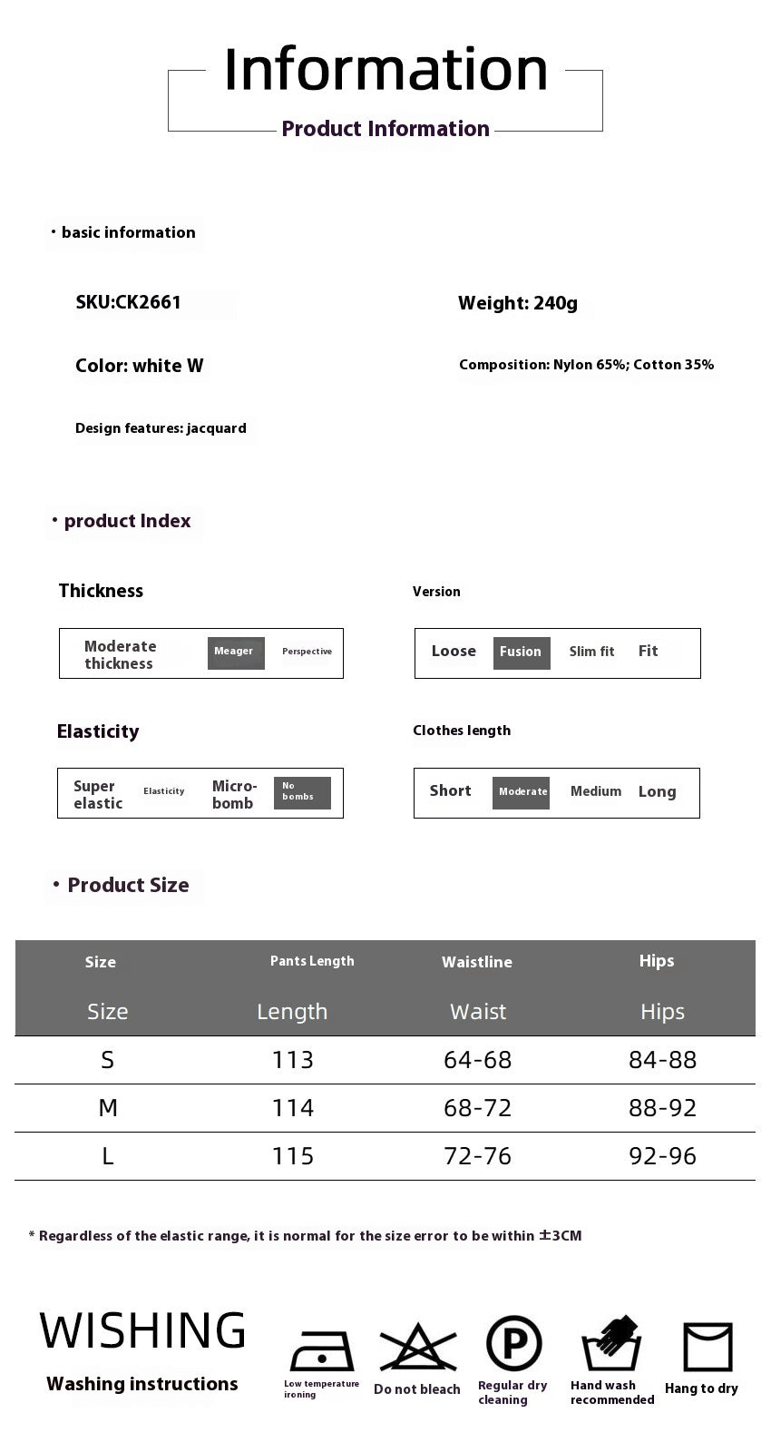 The main fabric of these pants is crafted from high-quality cotton lace, offering both breathability and a touch of elegance. The beautiful white jacquard design creates an eye-catching look while maintaining their casual charm. The high waist cut flatters your figure and provides a comfortable fit, allowing you to move freely with style.