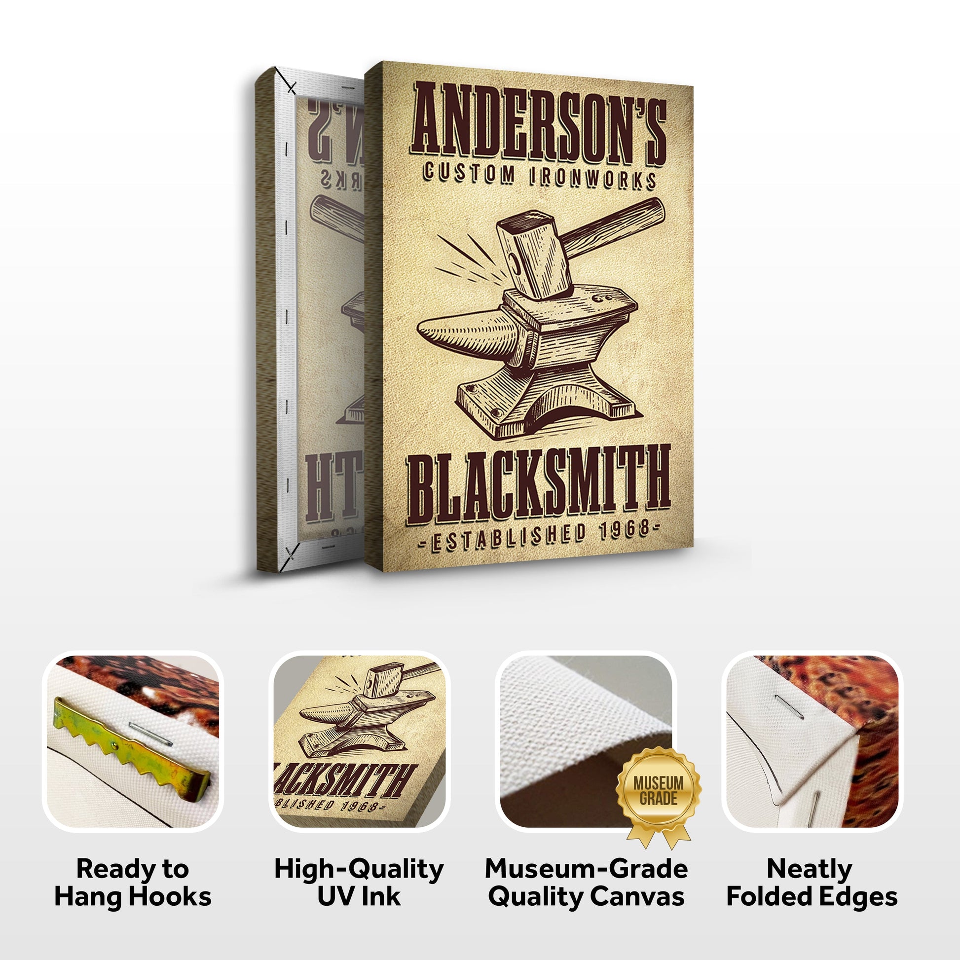 Are you ready to transform your living space into a haven of rustic elegance? Look no further than our Custom Ironworks Blacksmith Canvas Sign. Crafted with precision and passion, this exquisite piece of artistry isn't just a wall decor—it's an embodiment of timeless craftsmanship and personalized style.