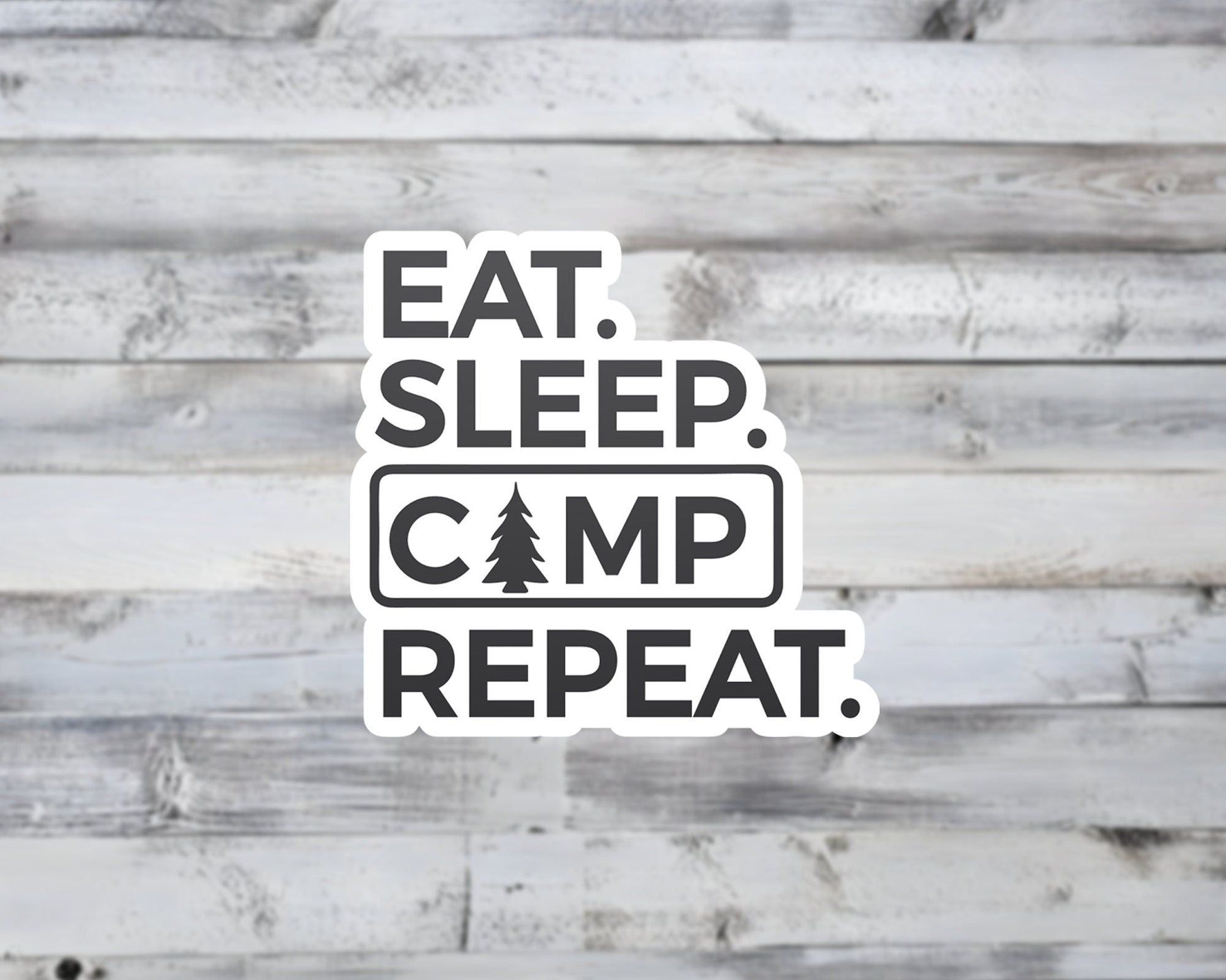 Our Eat Sleep Camp Repeat Vinyl Sticker is waterproof, durable, and perfect for personalizing your laptops, water bottles, phone cases, tablets, Kindles, planners, notebooks, journals, tumblers, mugs, mirrors, cars, motorcycles, and more!