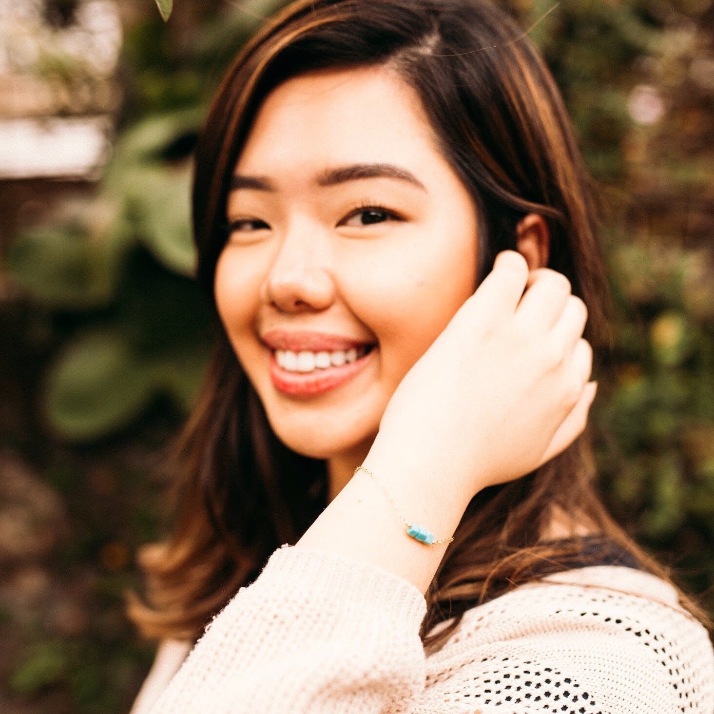 This turquoise beauty features a 14k gold filled chain and matches our Ena necklace. Wear this bracelet knowing you are making a difference in the lives of women!