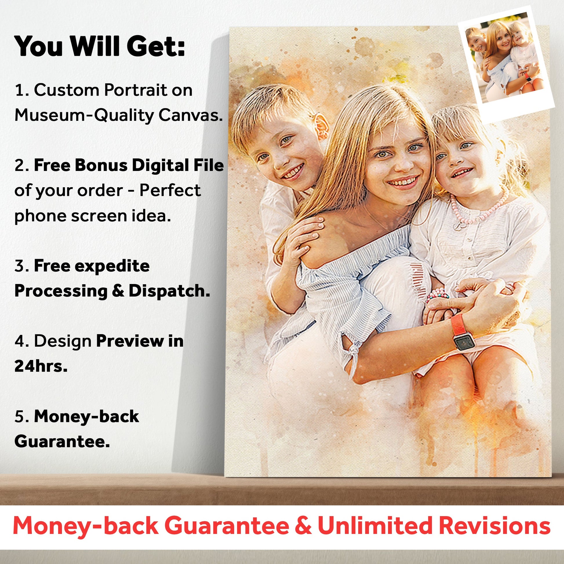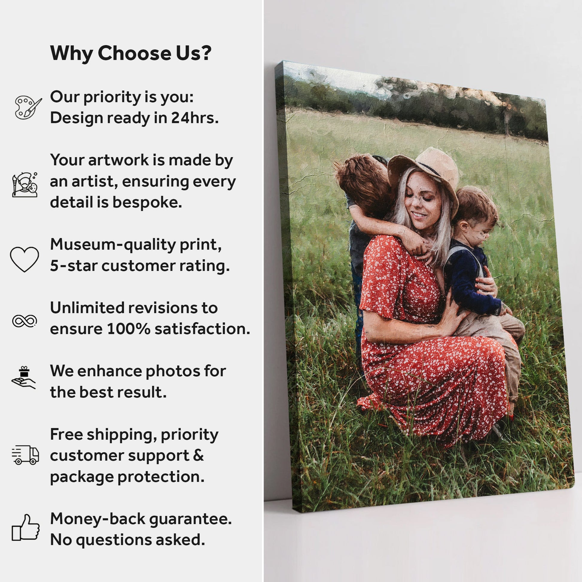 All you need to do is provide us with your favorite photo (via the upload button on this page, or via email instead), and we'll have our team create the most beautiful portrait you've ever laid your eyes on. It'll be like turning your favorite moment in time into a beautiful masterpiece to be shared with loved ones FOREVER.