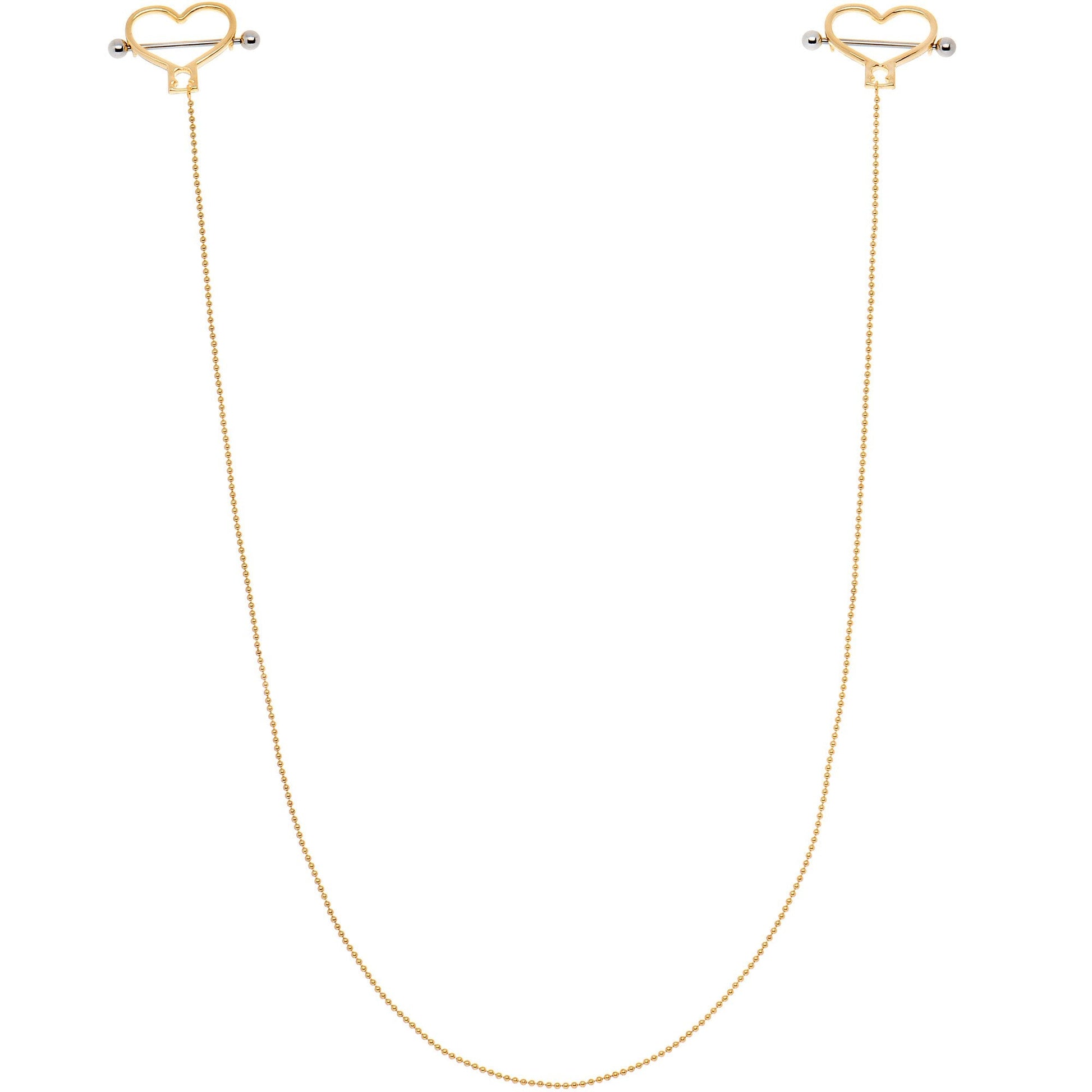 It's like a necklace for your breasts! This unique 14 gauge nipple chain jewelry is the perfect piercing to add to your body jewelry collection this Valentine's Day. This nipple ring chain features a pair of gold tone heart shaped nipple shields connected by a bead chain. With 1" straight barbells made from durable 316L surgical grade stainless steel, this 19" length nipple chain will really give you something to show off.