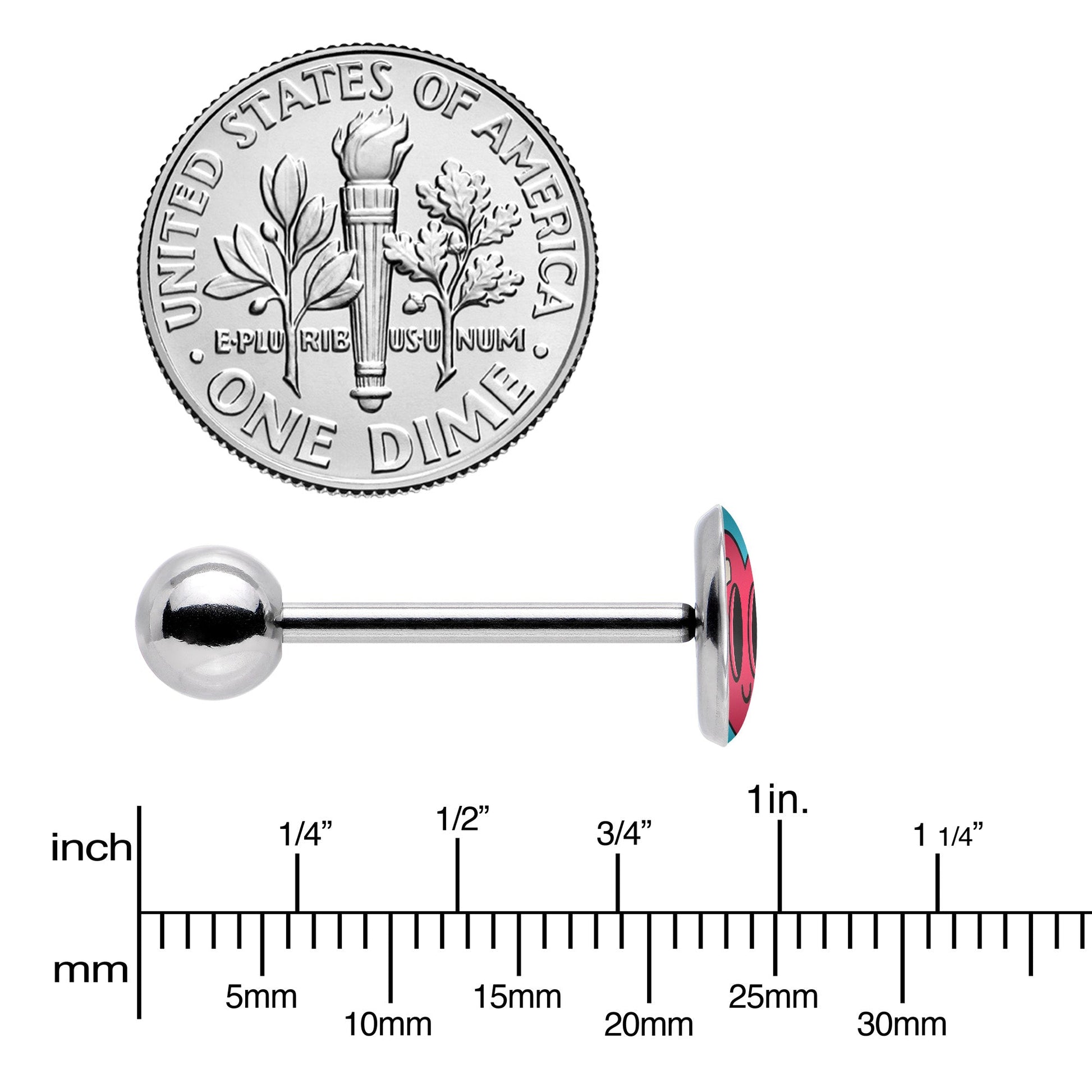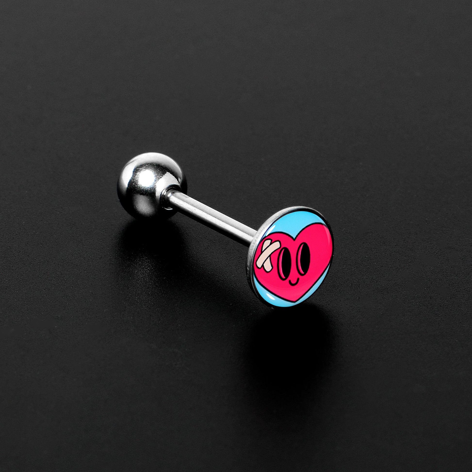 If your heart has been hurt, you're sure to fall in love with this 14 gauge tongue jewelry! It's made with a 5/8" durable 316L surgical grade stainless steel straight barbell with a 5mm bottom ball end. The top end features a blue, disc shaped charm that features an anthropomorphic heart. The heart has a pair of crossed bandages on it and a bravely smiling expression. Let love heal your wounds with this adorably courageous heart tongue piercing ring.