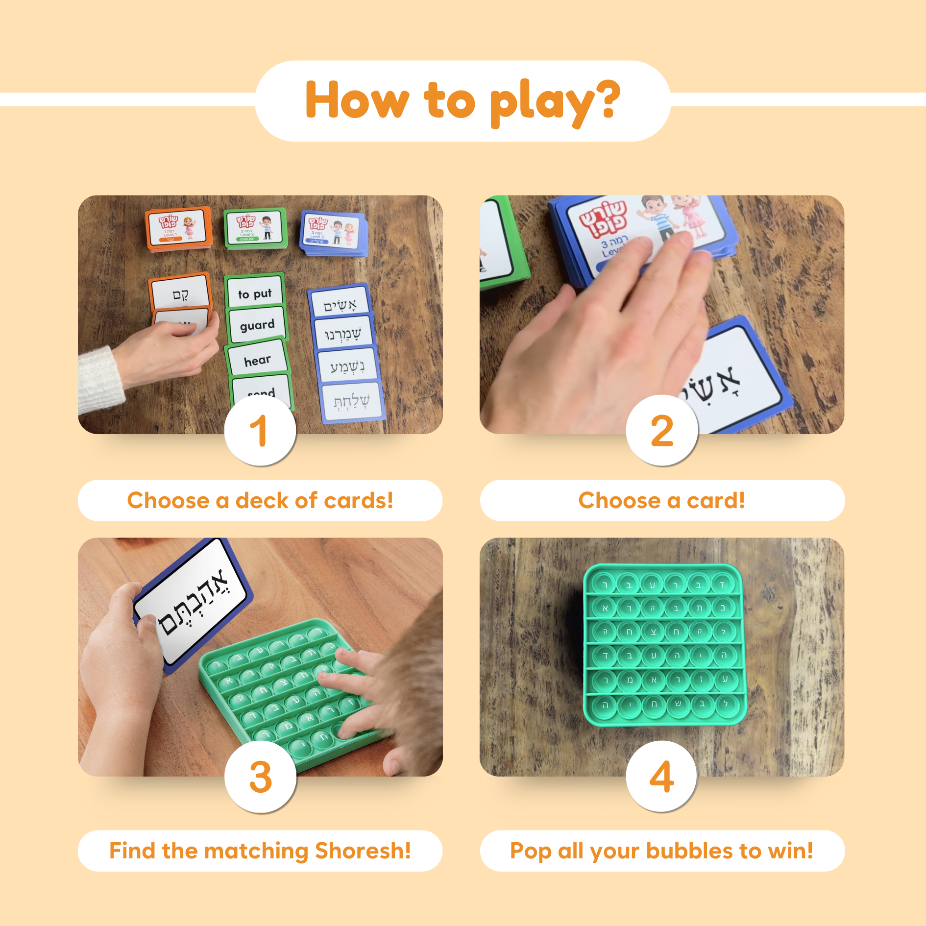 Shoresh Pop! is a fun, interactive Hebrew reading game for kids from Grade 1 to 5. Players pop bubbles on fidget mats while mastering shorashim (roots) and expanding their Hebrew vocabulary. With three dynamic card decks, children practice reading, translating, and matching Hebrew words, turning learning into an exciting adventure.