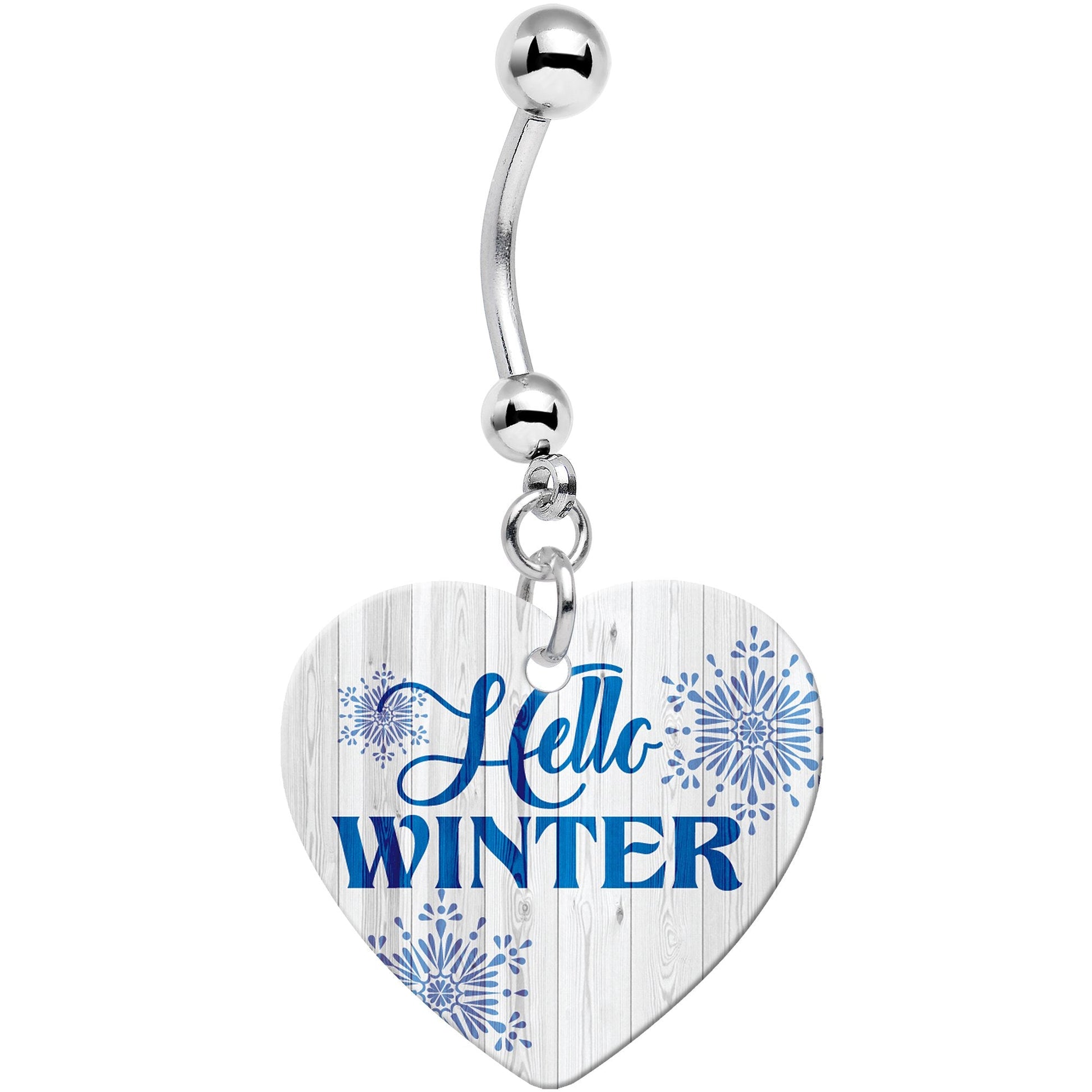 Get decked out from head to toe in Christmas spirit when you wear this 14 gauge festive holiday belly button ring! Made with a 7/16" durable 316L surgical grade stainless steel curved barbell, this holiday navel ring features the message, "Hello Winter" in blue with blue snowflakes on a white heart charm. This winter snowflake holiday navel jewelry makes a perfect seasonal gift for someone special to you.
