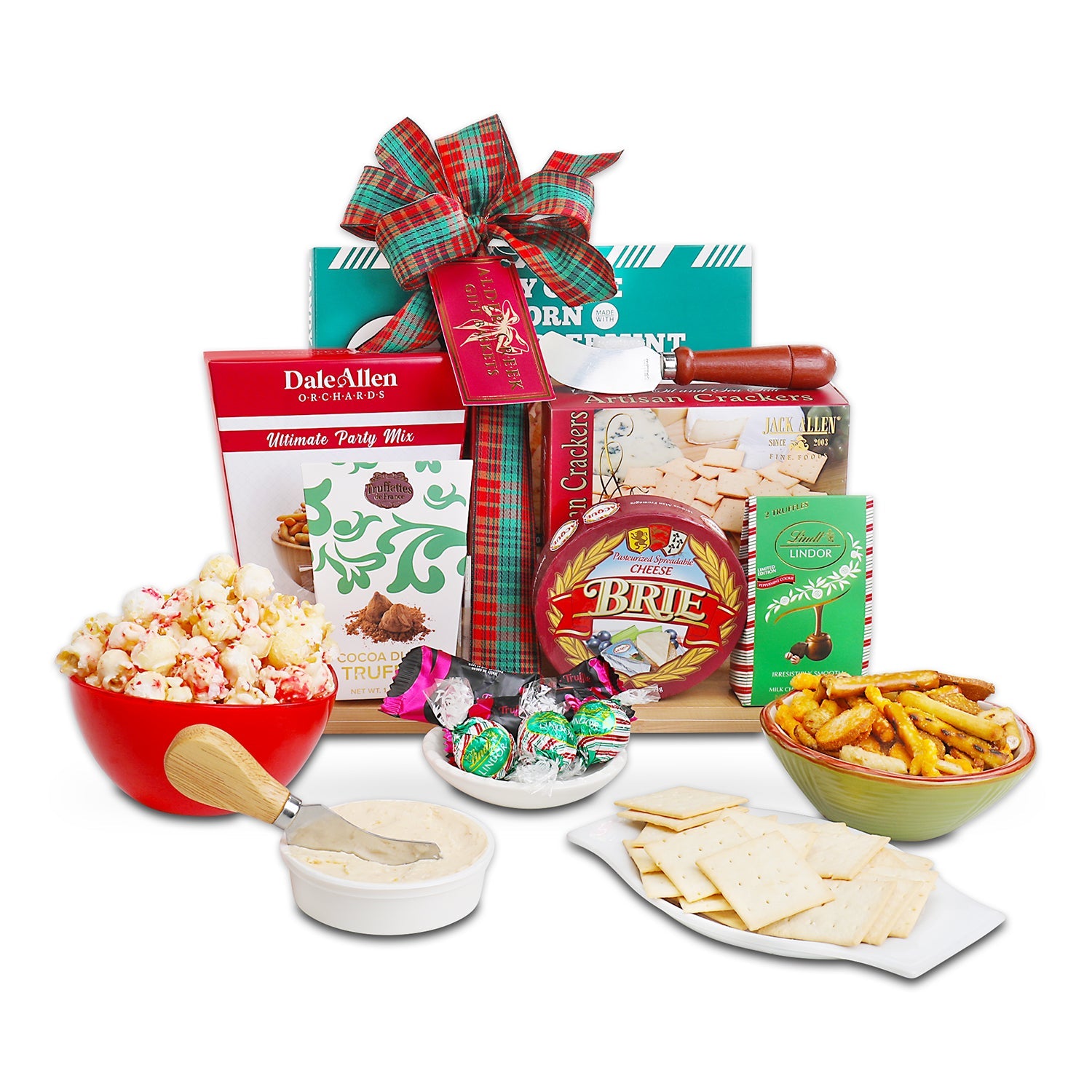 Contents: Gourmet Cracker (2oz.), Lindt Lindor Chocolate Peppermint Cookie Truffles (2pcs.), Holiday Popcorn (6oz.), Truffettes de France Cocoa Dusted Truffles (1.2oz.), Bruschetta Mix (3oz.), Spreadable Cheese (3.5oz.), Stainless Steel Cheese Knife with Wooden Handle, Reusable Wood Cutting Board (13.75in. x 6.5in. x 0.625in.)