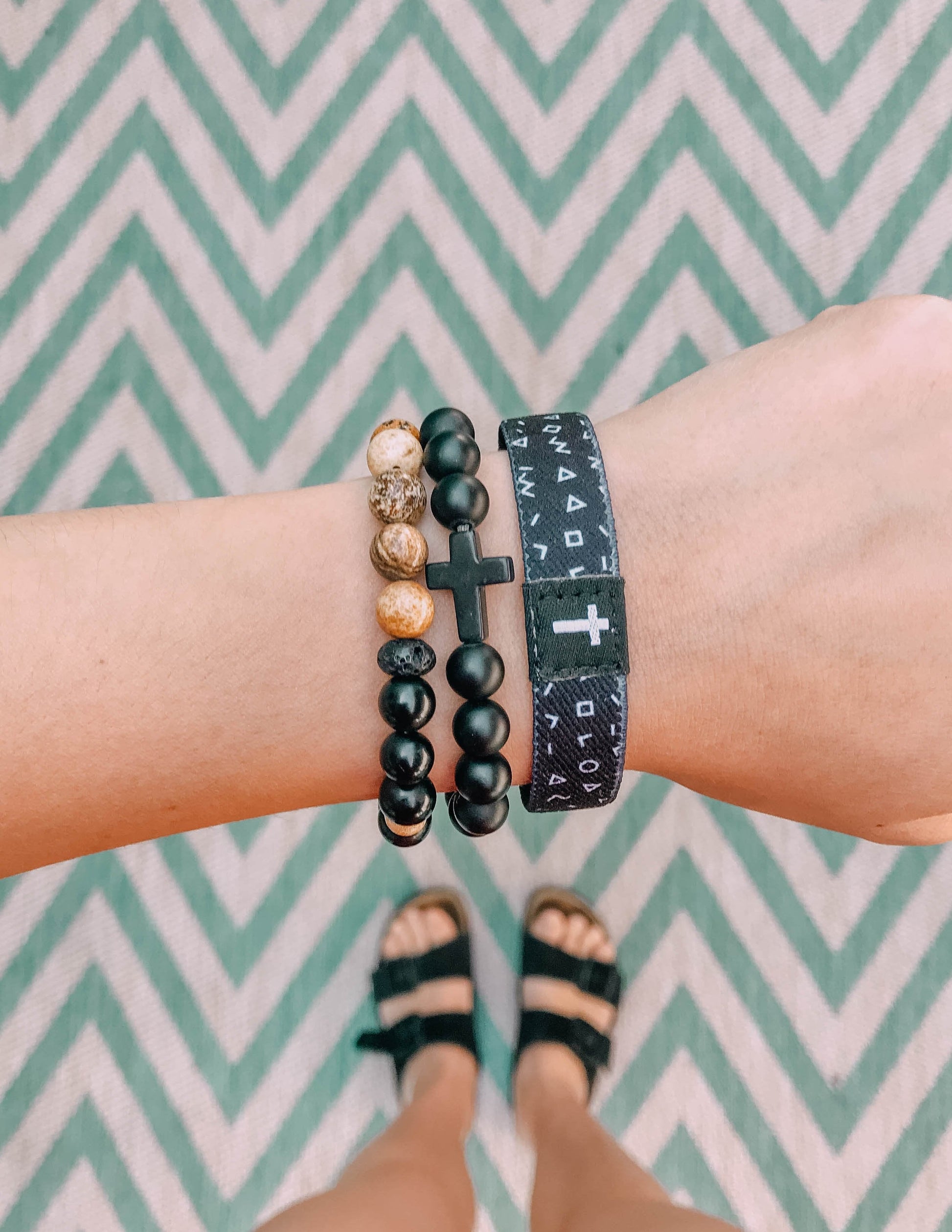 The wooden section of the stone bracelet represents humility, and the black represents pride. This shows the constant struggle in our lives between humility and pride and is a reminder of how God wants you to live: with humility.