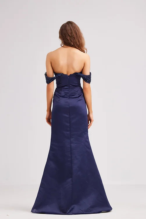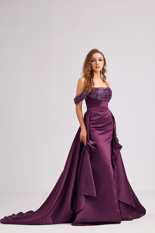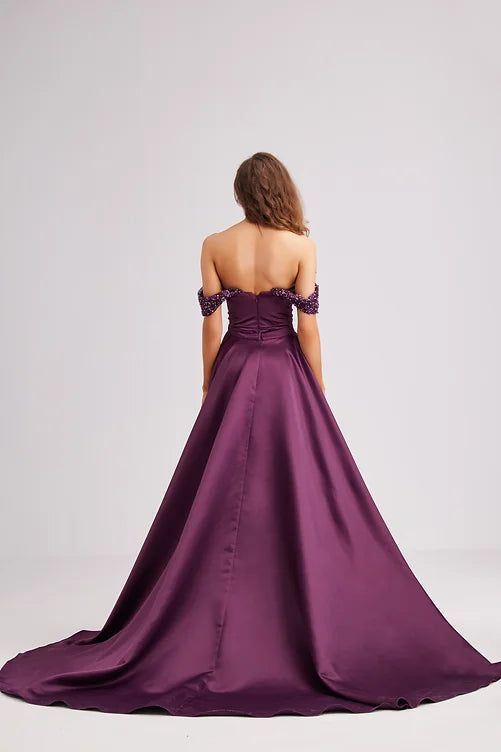 Introducing the J23019, the epitome of luxury and sophistication. This strapless design and straight-line cut will make you the belle of any special occasion. With a removable skirt and A-line silhouette, this gown offers versatility and elegance. Available in regal shades of purple and navy.
