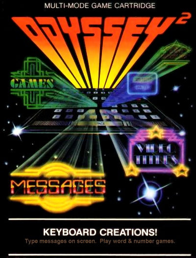 KEYBOARD CREATIONS! It turns your words into a light show that travels across your TV screen. There's a myriad of applications! You can make professional looking titles for your videotape recordings. (a special "date line" even includes a computerized digital clock that displays the actual time the recording was made.) It turns your TV set into a message center that can't be missed! KEYBOARD CREATIONS televises birthday, anniversary and holiday greetings at parties - and telecasts your own commercial messages for business! This immensely versatile cartridge even plays word games to make spelling practice fun for kids and to present totally unique challenges at the adult level. Full sync-sound action! Digital clock! Background color control!