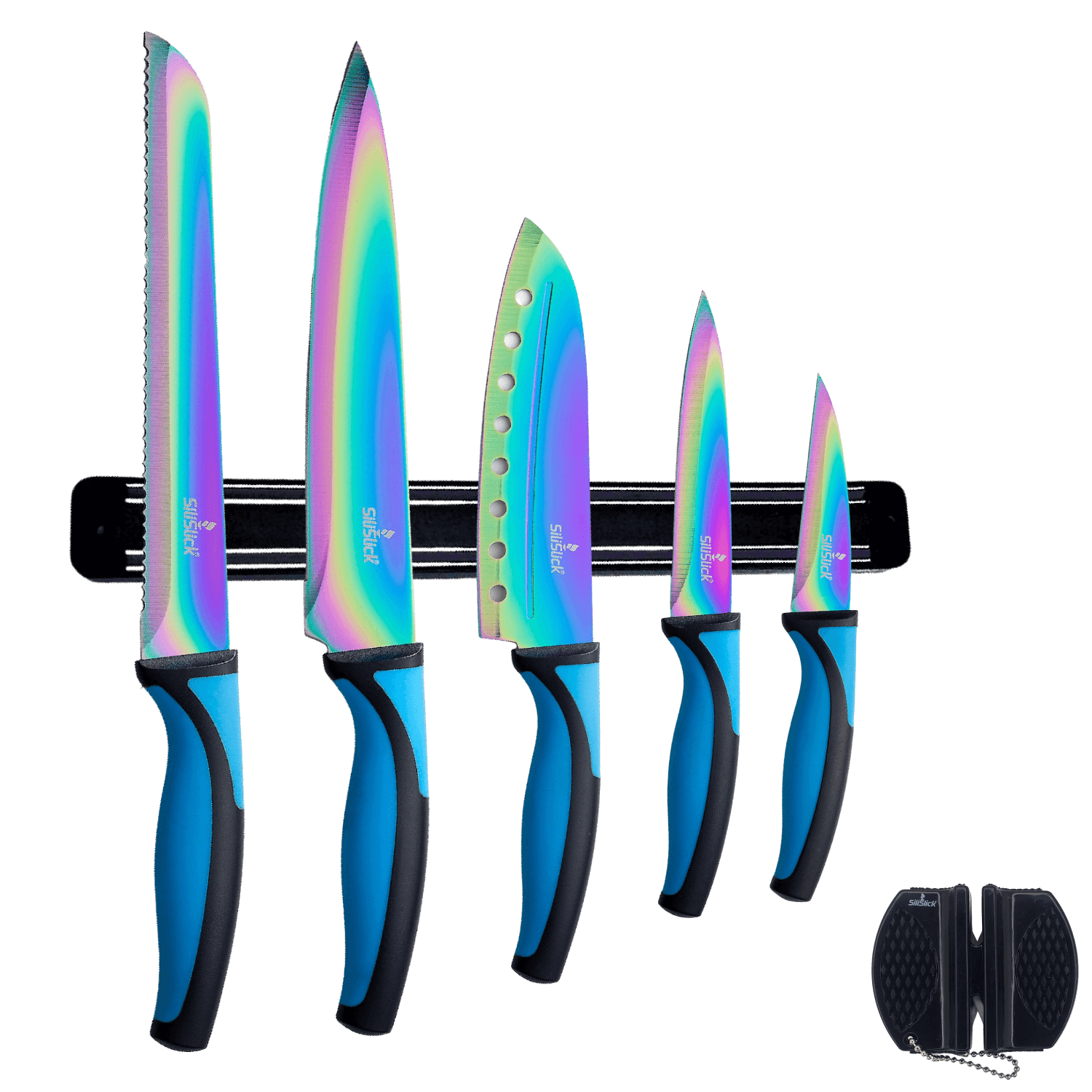 ✅ WHAT’S INSIDE : Upgrade your kitchen with our professional grade SiliSlick starter knife set. This kitchen knife set kit includes 5 essential knives: an 8" Chef Knife for all-purpose slicing, an 8" Bread Knife for perfectly even cuts, a 7" Santoku Knife for precision dicing, a 5" Utility Knife for medium-sized tasks, and a 3.5" Paring Knife for intricate work. Each blade is honed to a sharp, precision edge and coated in non-stick titanium for easy slicing and clean cuts. The set also includes a magnetic knife holder for safe storage and easy access to your knives, as well as a sharpener to keep your blades in top condition. Perfect for home cooks and professional chefs alike.