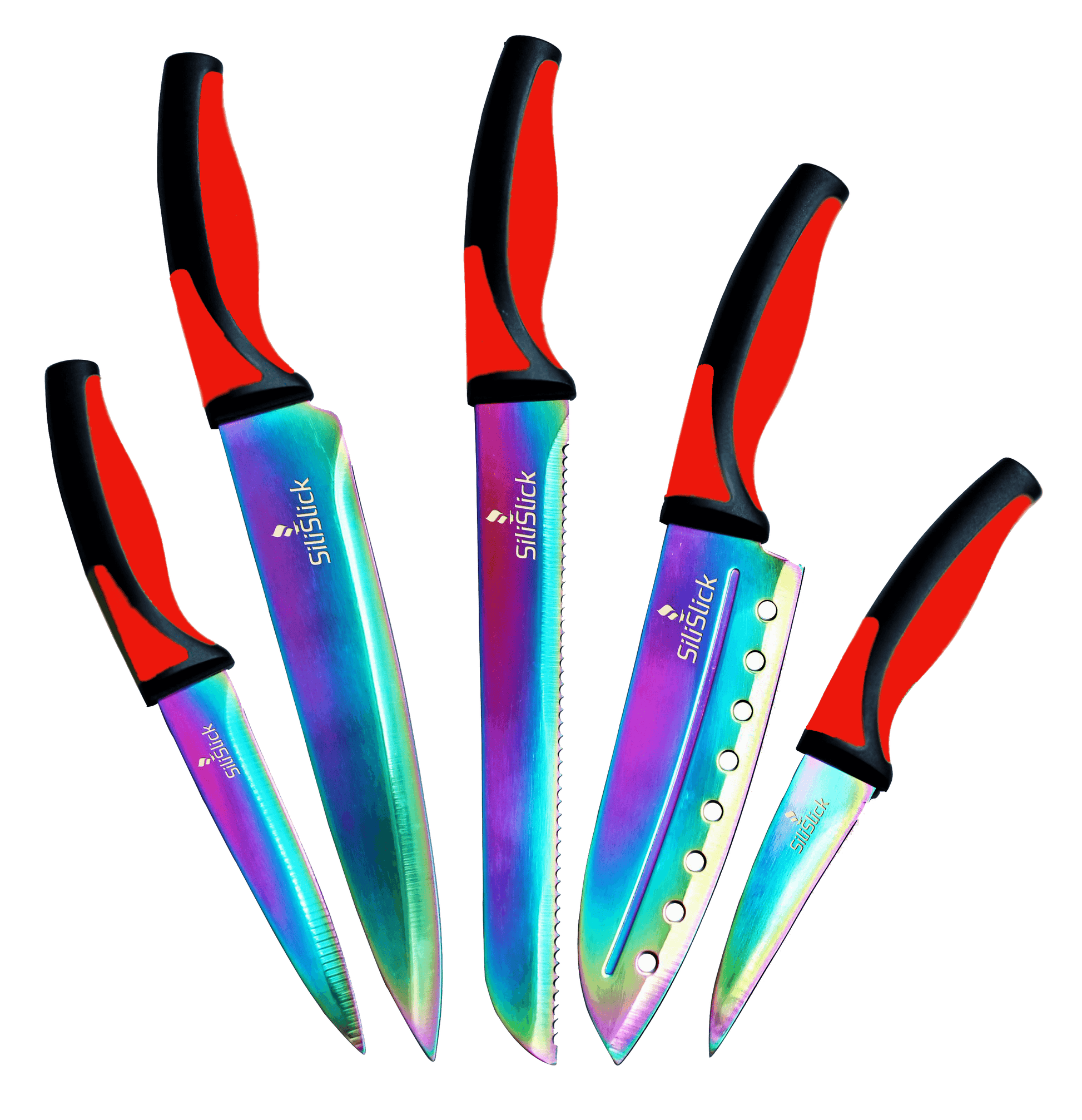 🔪 FOOD GRADE STAINLESS STEEL : Experience exceptional durability and performance with our food grade stainless steel knives. Our kitchen knife set crafted from superior quality stainless steel, each blade is finely sharpened and plated with non-stick titanium for a colorful, iridescent finish that adds a touch of style to your kitchen. This knife set includes a 20.3cm/8" Chef knife, 20.3cm/8" Bread knife, 17.75cm/7" Santoku knife, 12.7cm/5" Utility knife and 8.9cm/3.5" Paring knife
