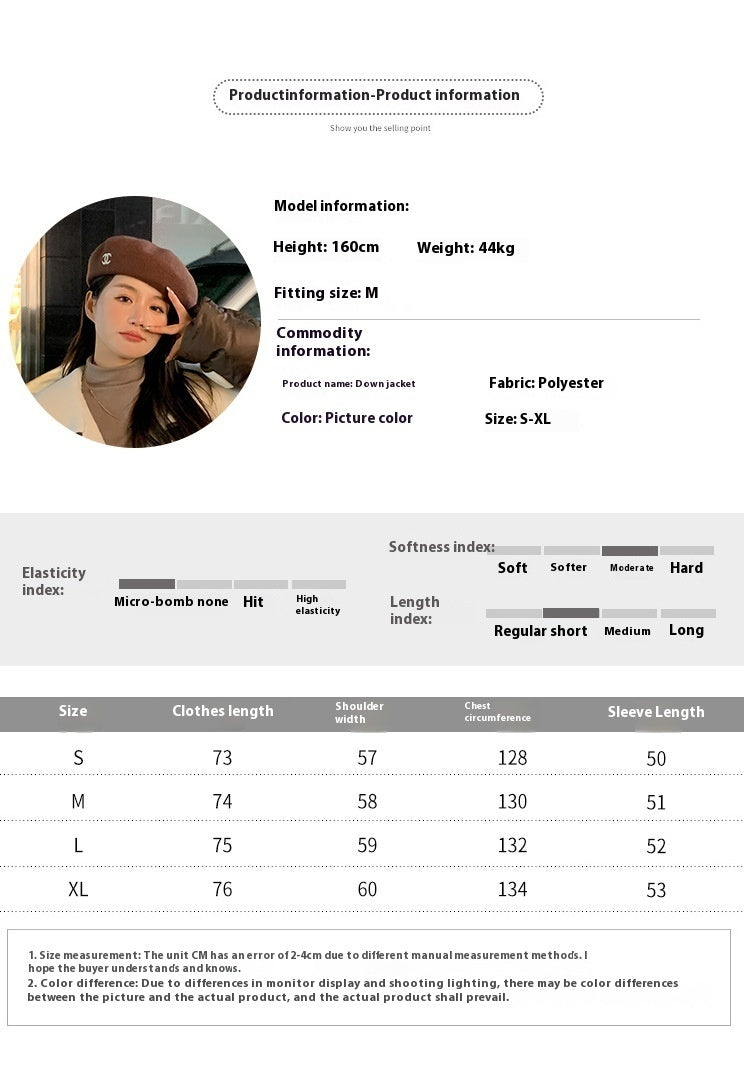 This elegant down jacket is designed in a rich brown color, adding a touch of sophistication to your outfit. Available in sizes S, M, L, and XL, it features a loose version for ultimate comfort. The short length of the jacket, measuring 40cm, makes it versatile and perfect for layering over sweaters or blouses.