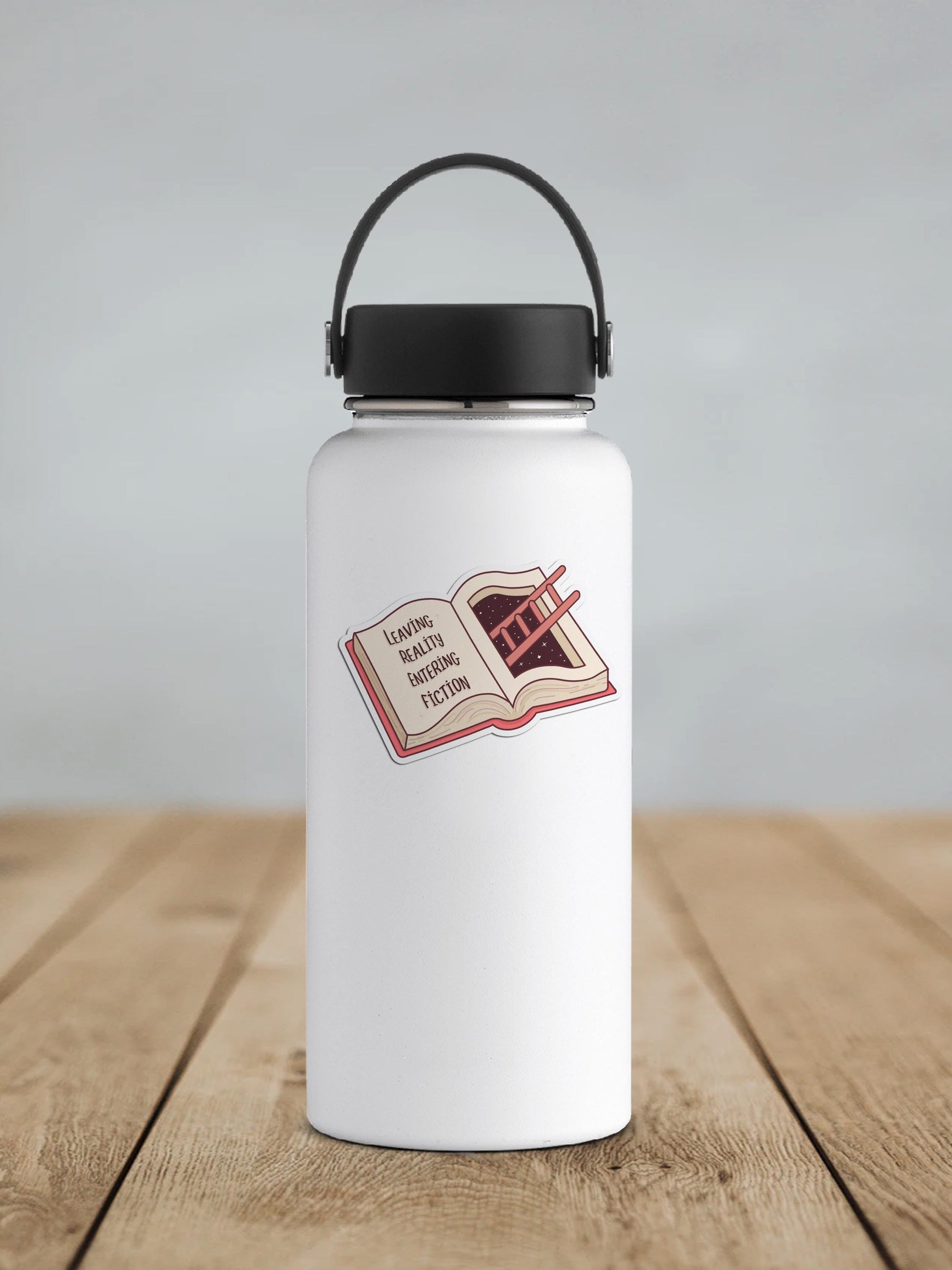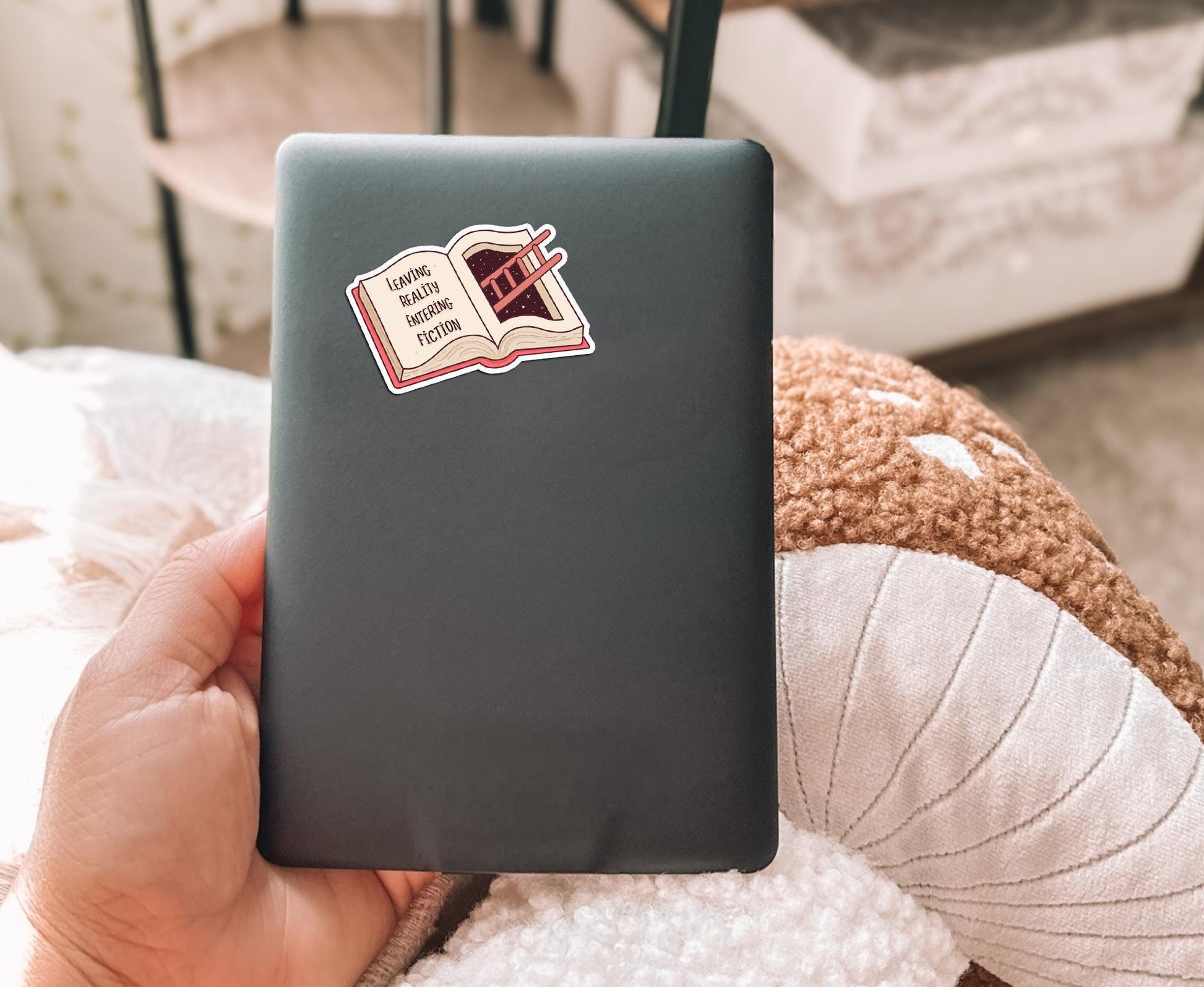 Our Leaving Reality Entering Fiction Vinyl Sticker is waterproof, durable, and perfect for personalizing your laptops, water bottles, phone cases, tablets, Kindles, planners, notebooks, journals, tumblers, mugs, mirrors, cars, motorcycles, and more!