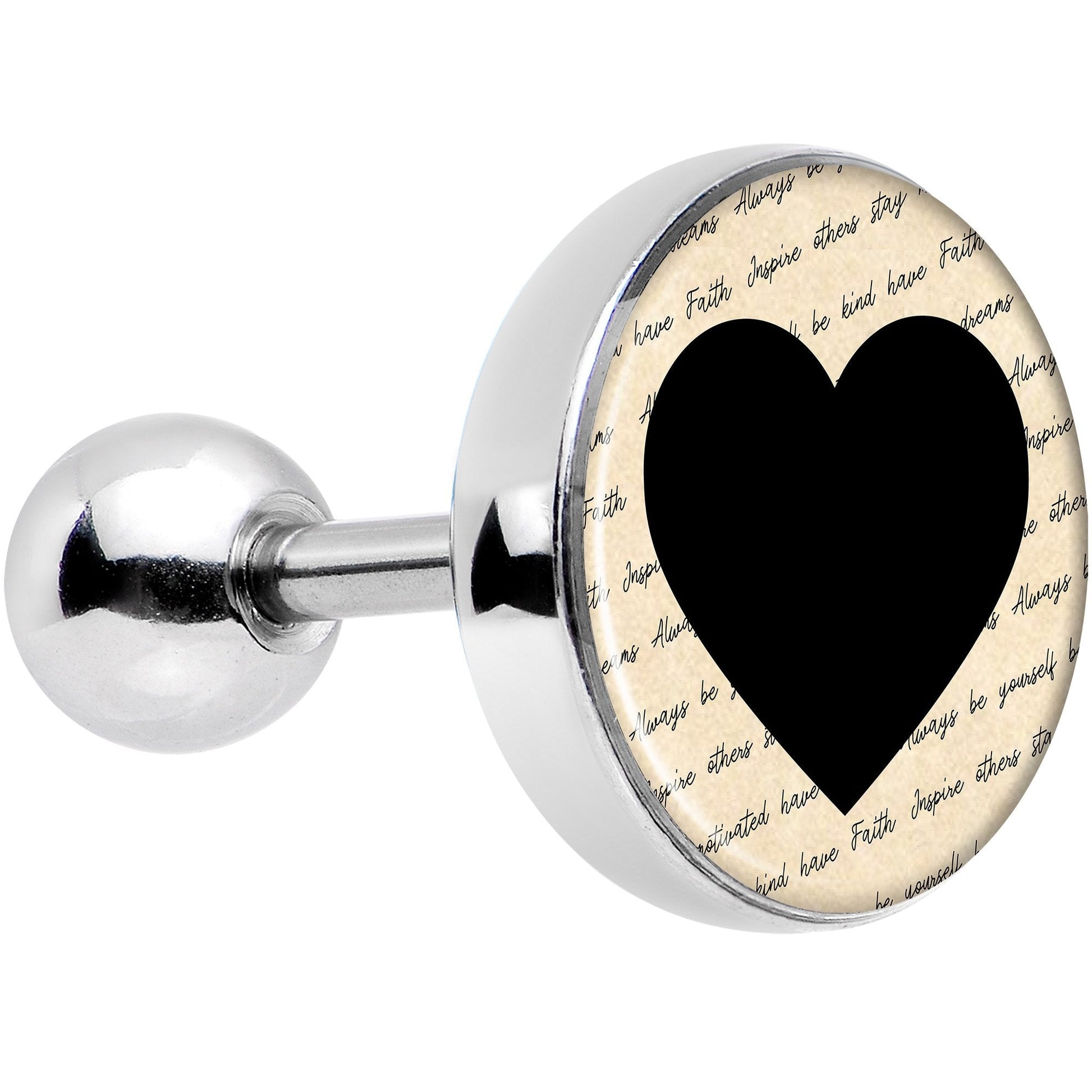 If you love Valentine's Day inspired images with a unique twist then this cartilage jewelry is right for you! Made with a 7/16" durable 316L surgical grade stainless steel straight barbell, this tragus earring features a black heart over a love letter background logo inlay.